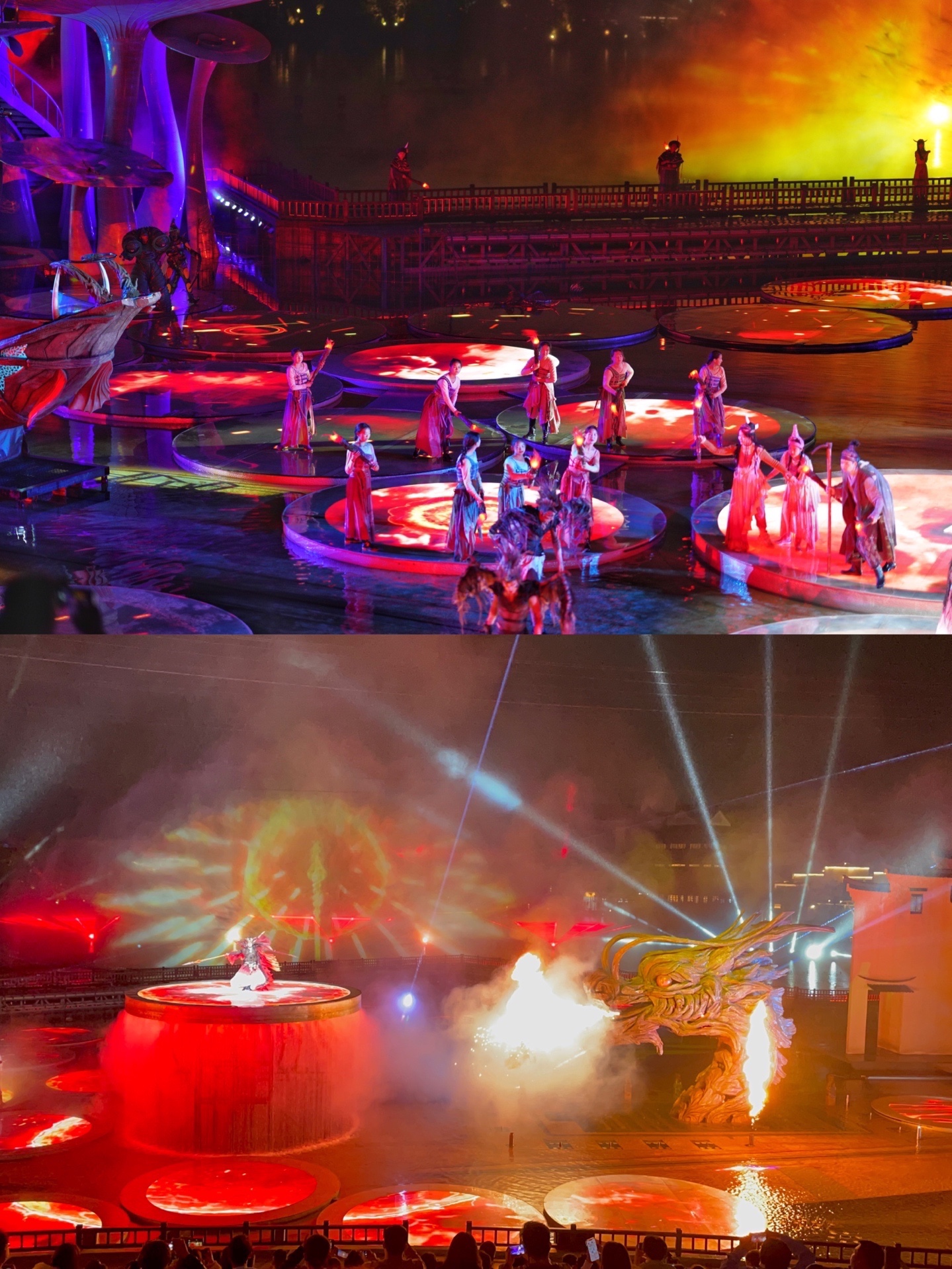 每天19:30-20:30,看过之后觉得必看!讲述婺女斗恶龙的故事,整个舞美、灯光、火、道具都很棒,演员也是。演出中有焰火,演出结束后还有一分半钟的烟花秀,像过春节。