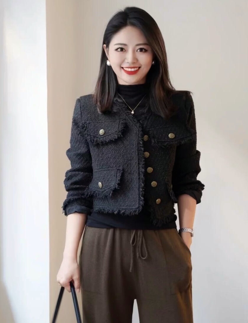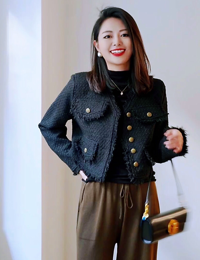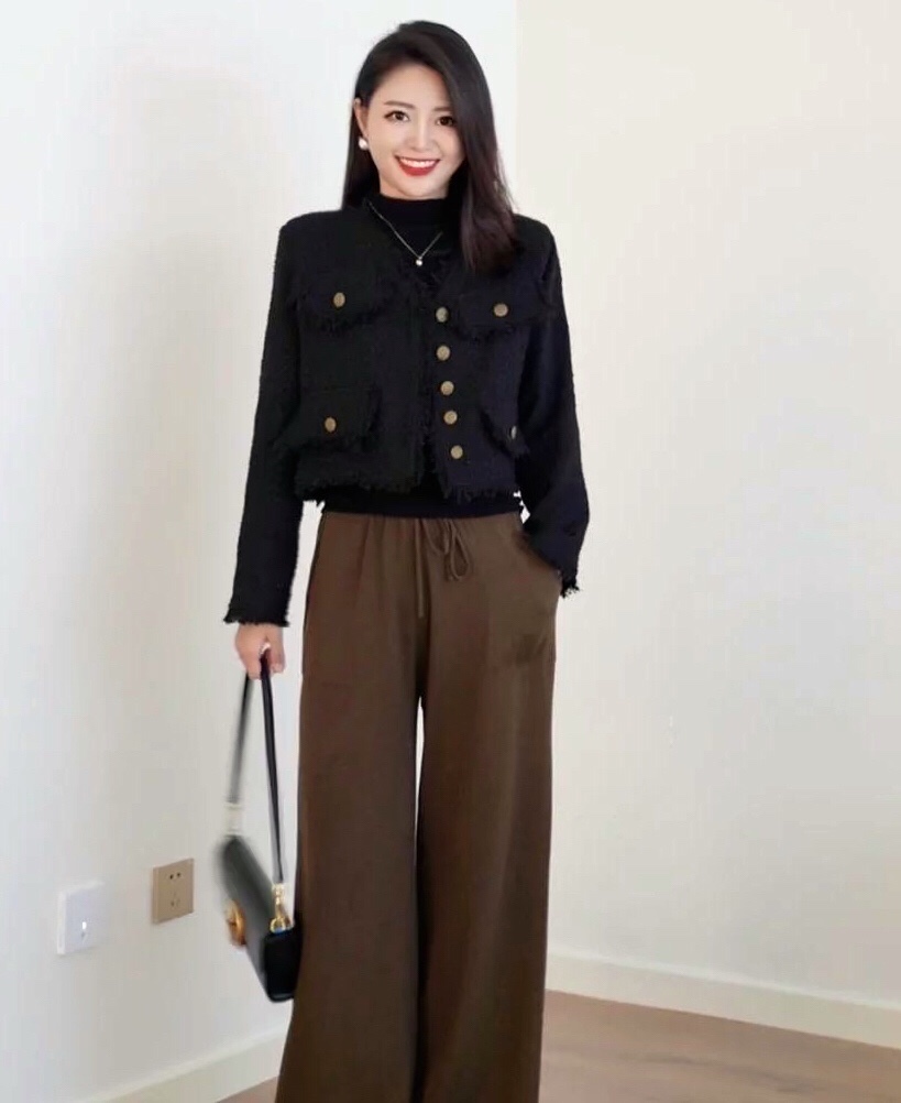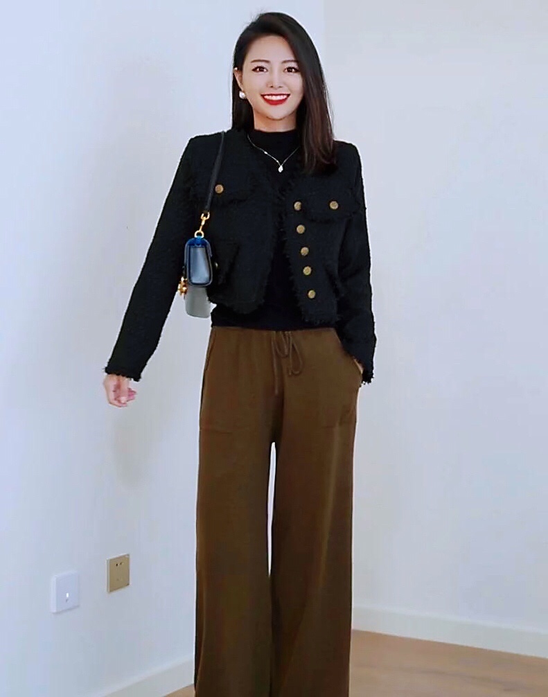 短款设计的黑色小香风外套叠穿黑色毛衣,精致又温柔,搭配高腰裤,一眼看上去就显得很高。