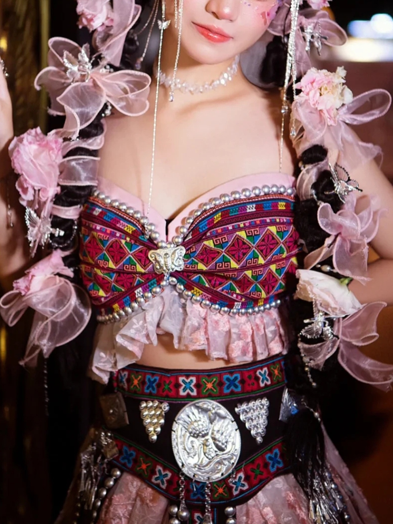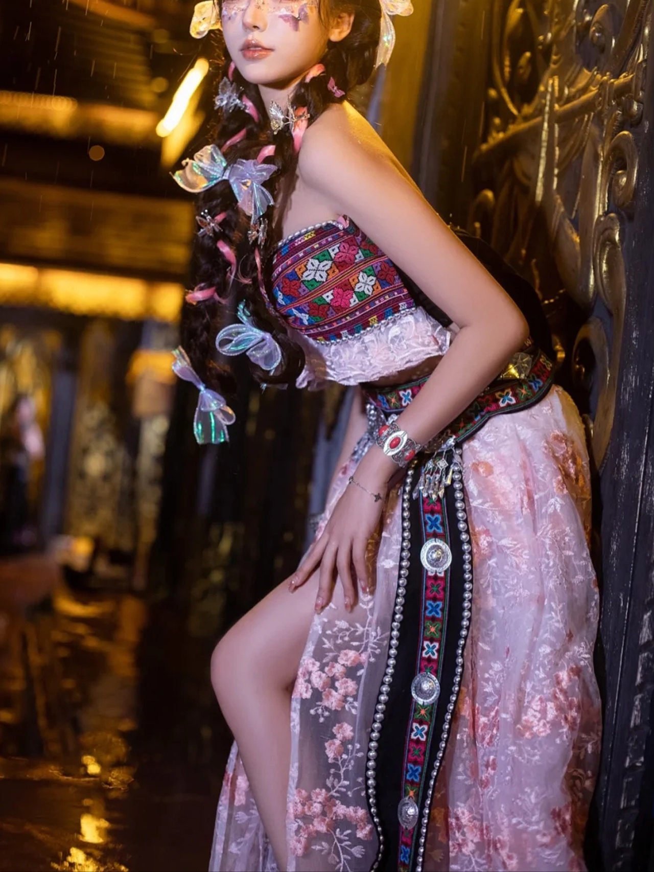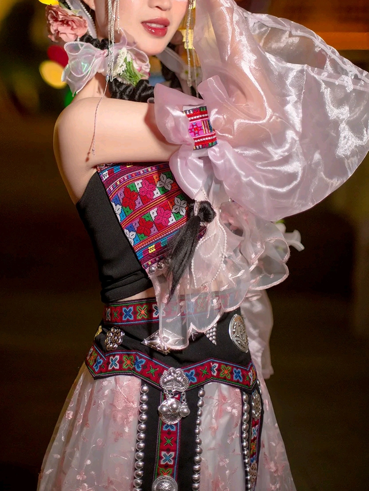 西双版纳网红打卡哈尼族服装女写真粉色刺绣长裙定制旅拍演出服饰