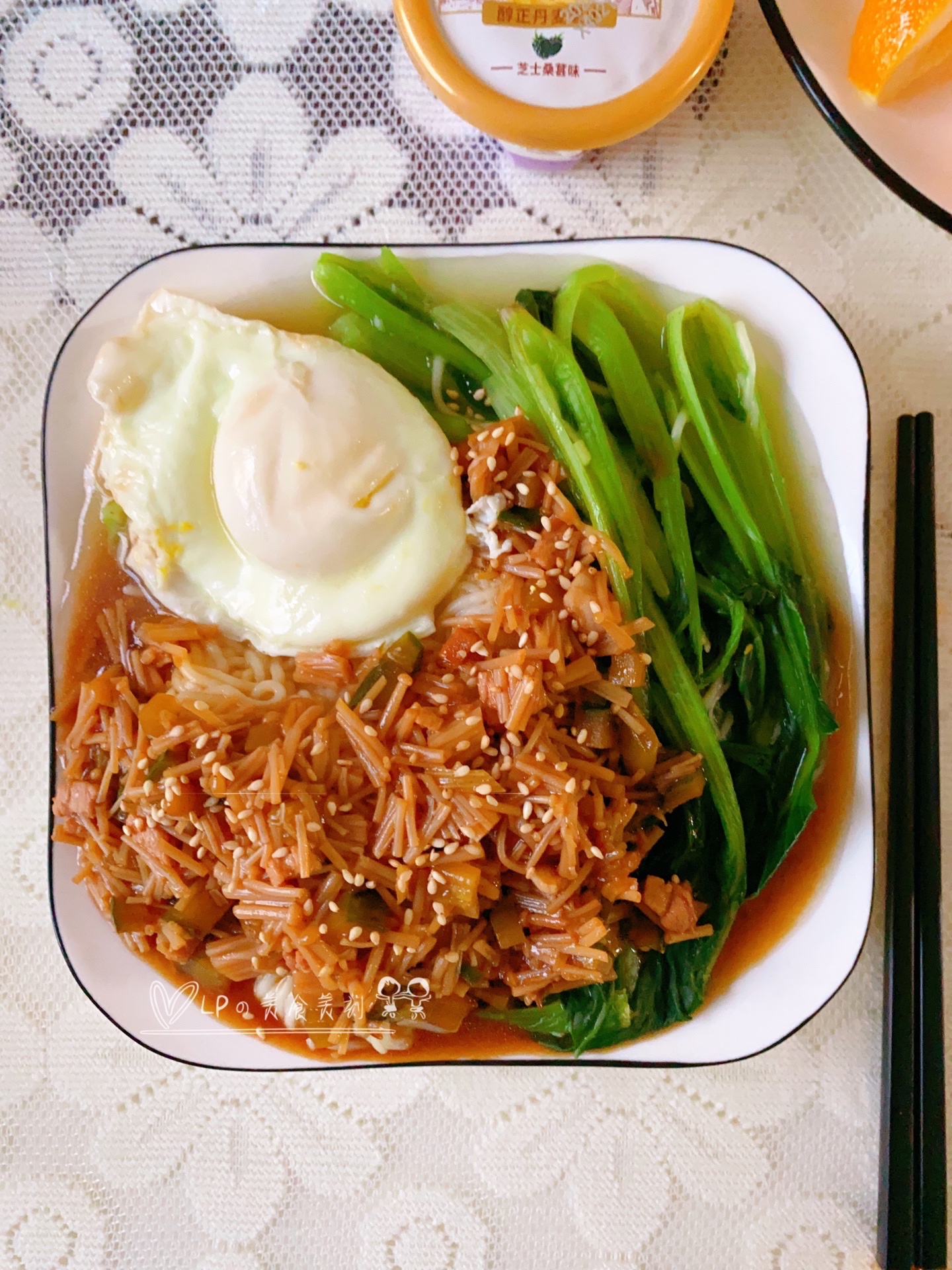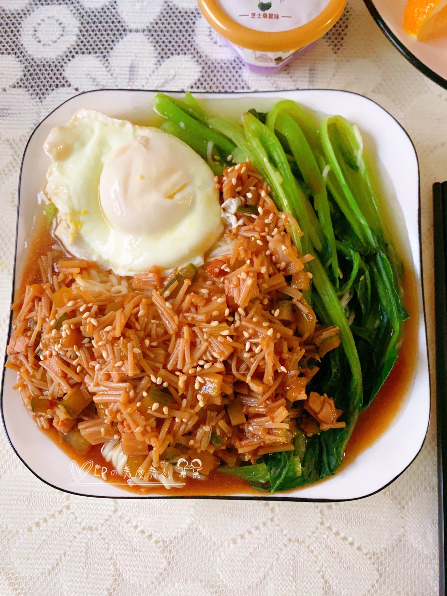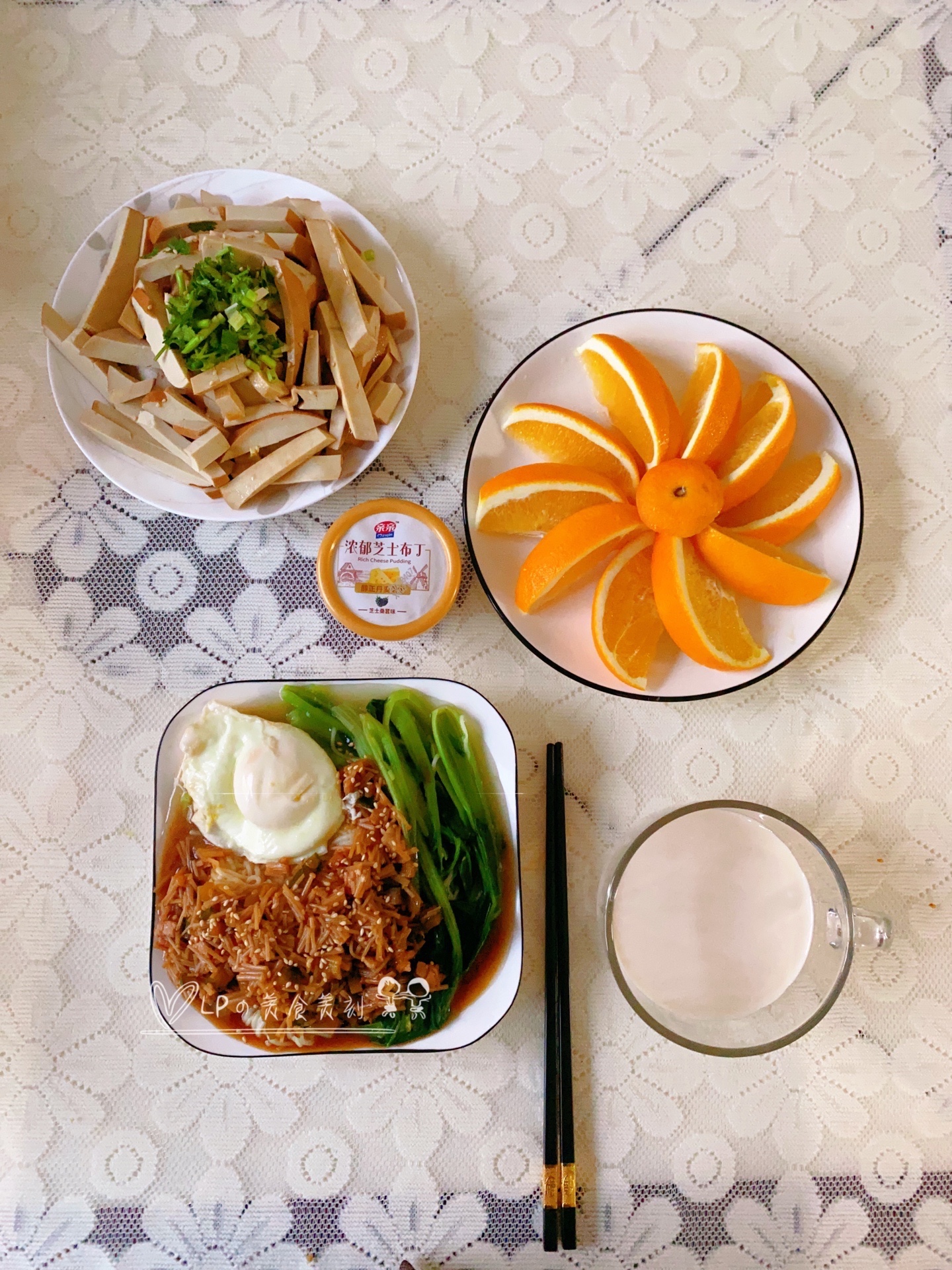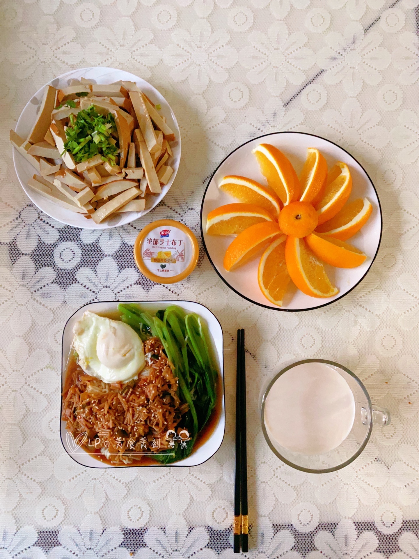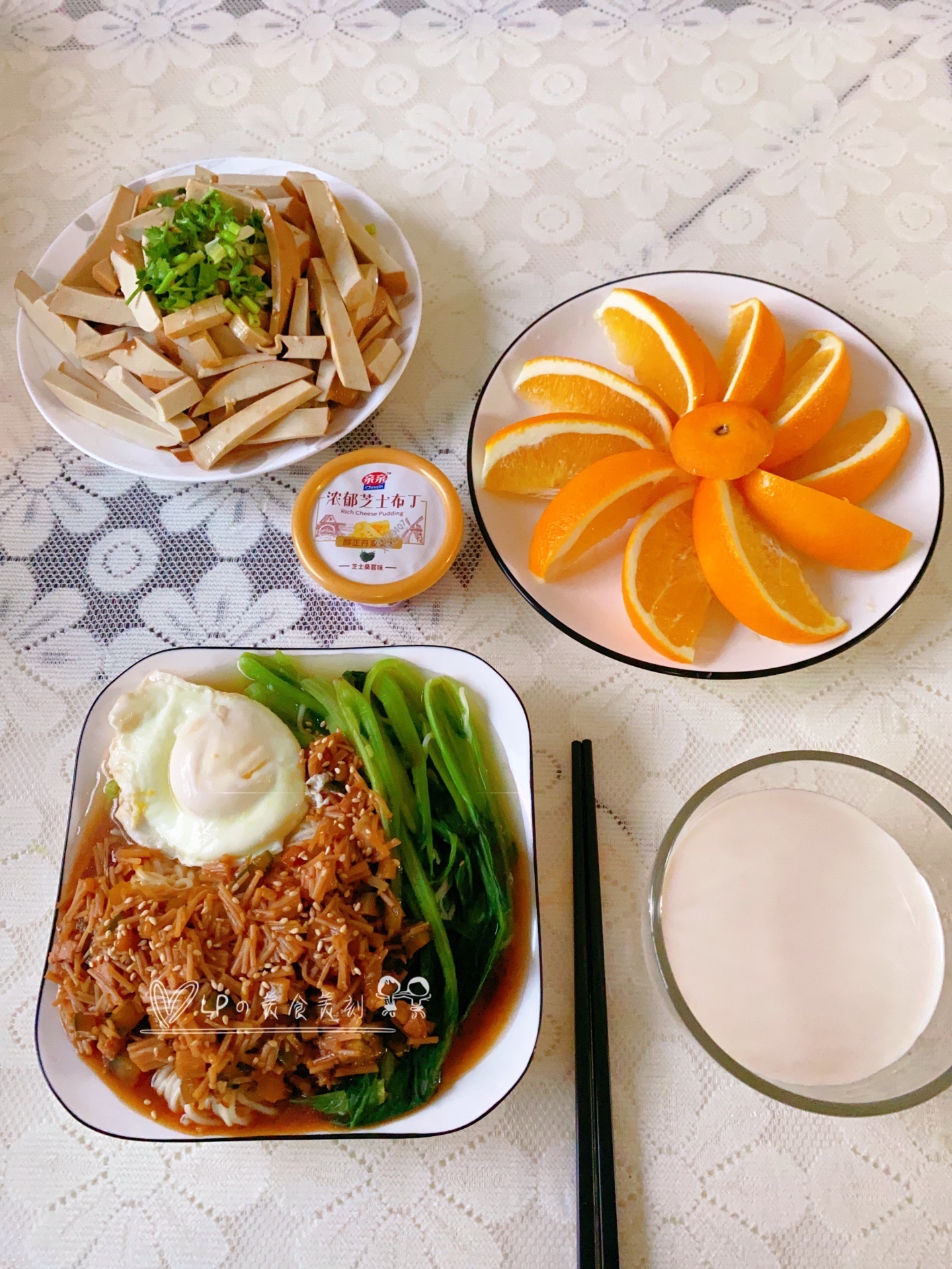 [让我看看][让我看看]周二早餐打卡:肉末金针菇打卤面、凉拌豆腐干、秋橙、早餐奶[好的][好的]