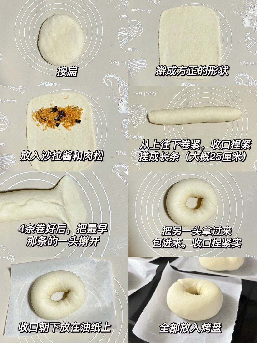 步骤4⃣️:按扁,擀成方正的形状,放入沙拉酱和肉松,从上往下卷紧,收口捏紧,搓成长条(大概25厘米)。