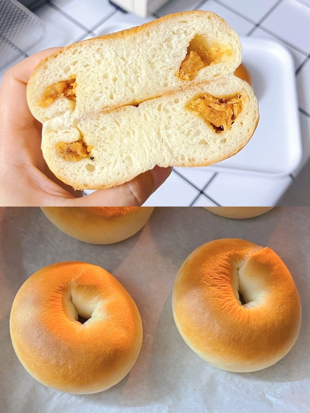 烤好的贝果表面脆韧,里面松软~太好吃了!