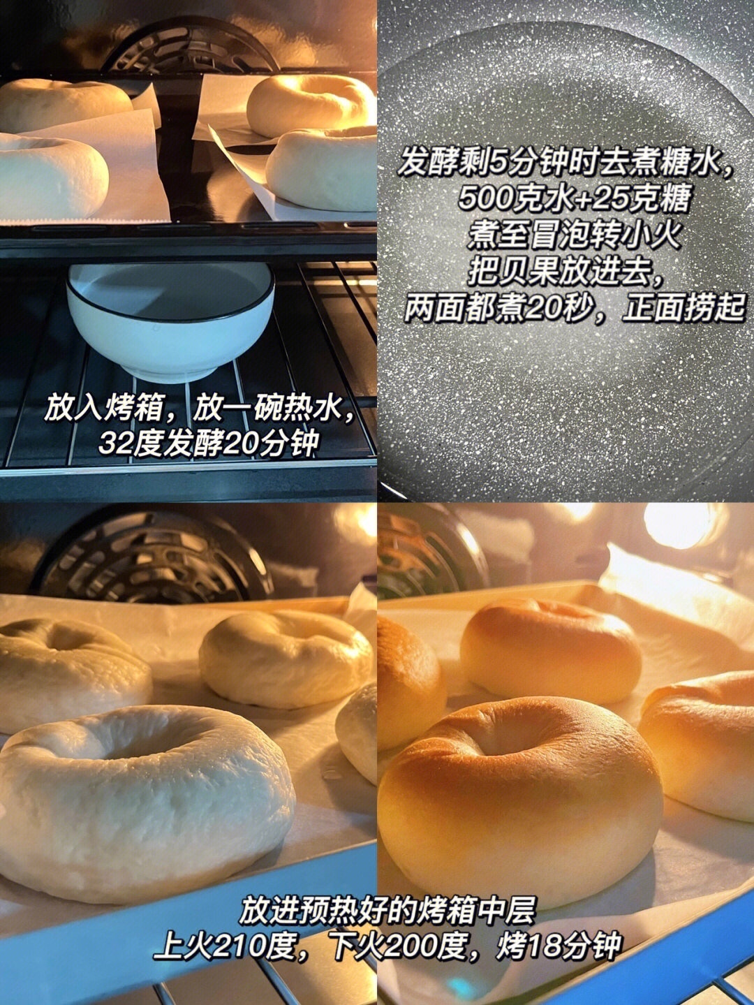 步骤6⃣️:放进烤箱,放一碗热水,32度发酵20分钟。最后5分钟去煮糖水,煮至水冒泡转小火,把贝果放进去,两面都各煮20秒,正面捞起放到垫了油纸的烤盘里(同时预热烤箱10分钟)。