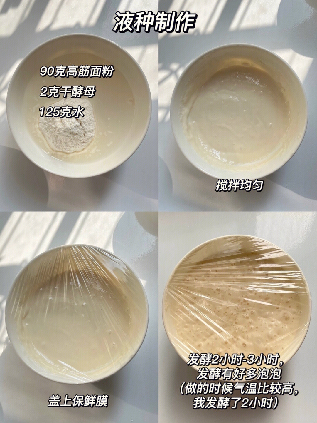 步骤1⃣️:先做液种,90克高筋面粉+2克高酵母+125克水混合一起,搅拌均匀,盖上保鲜膜,发酵2小时-3个小时(发酵好表面会有很多泡泡)。我做的时候气温高,发酵了2小时。