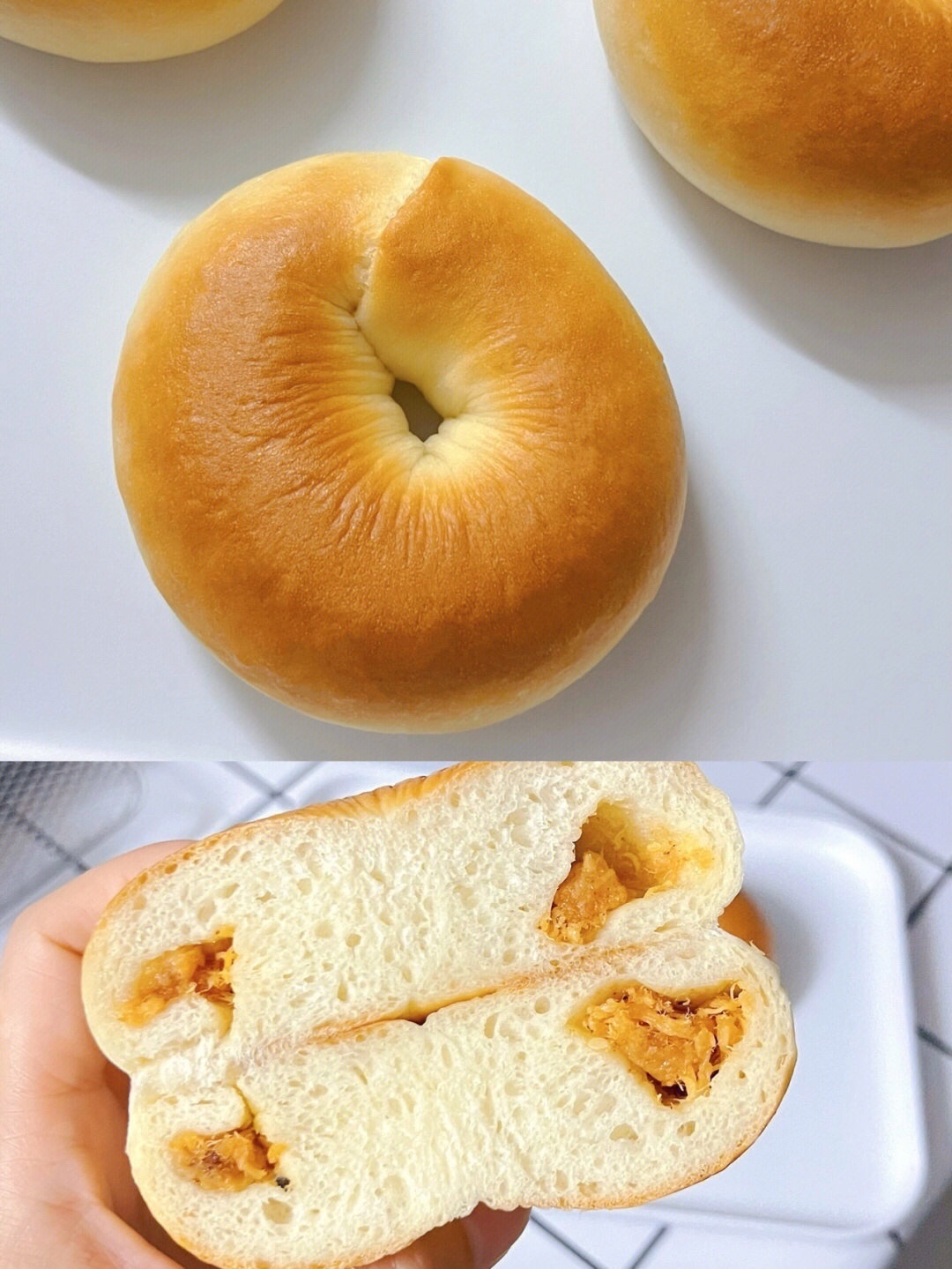 贝果可以不放馅,原味贝果也很好吃,切开可以夹各种自己喜欢的馅。