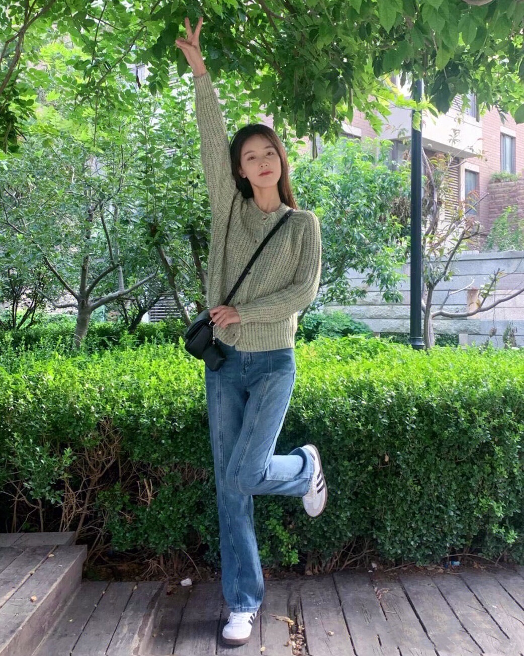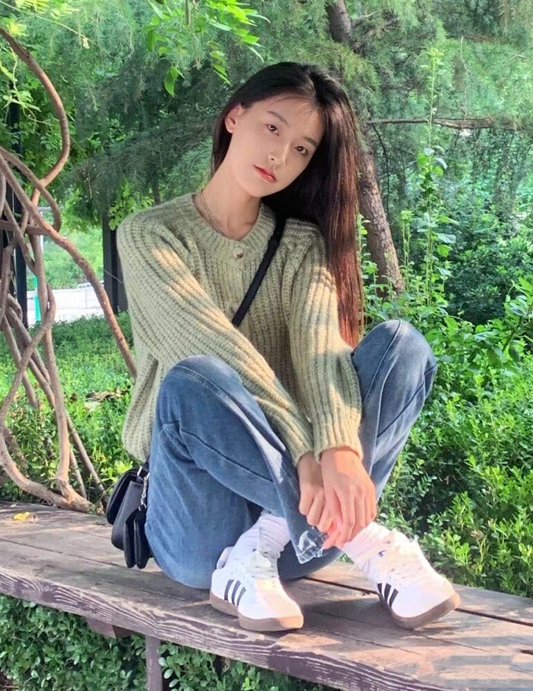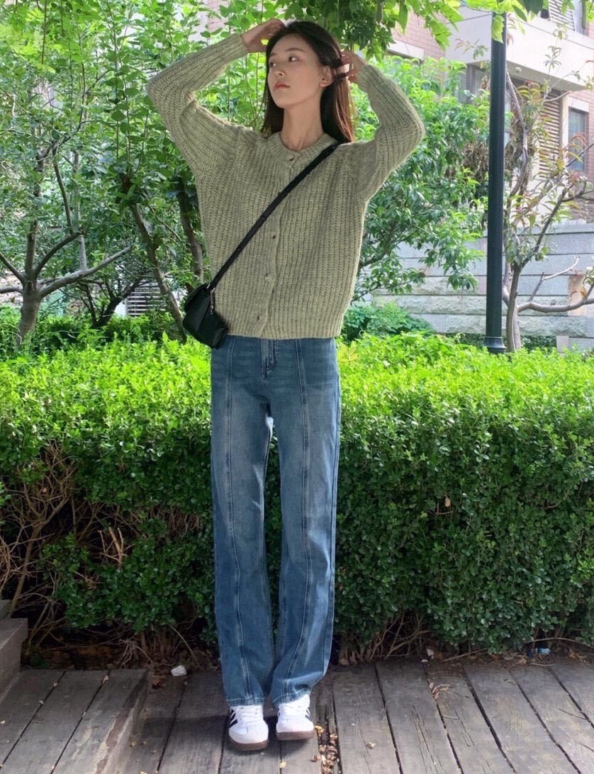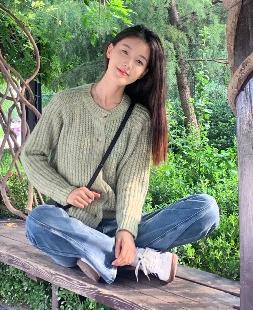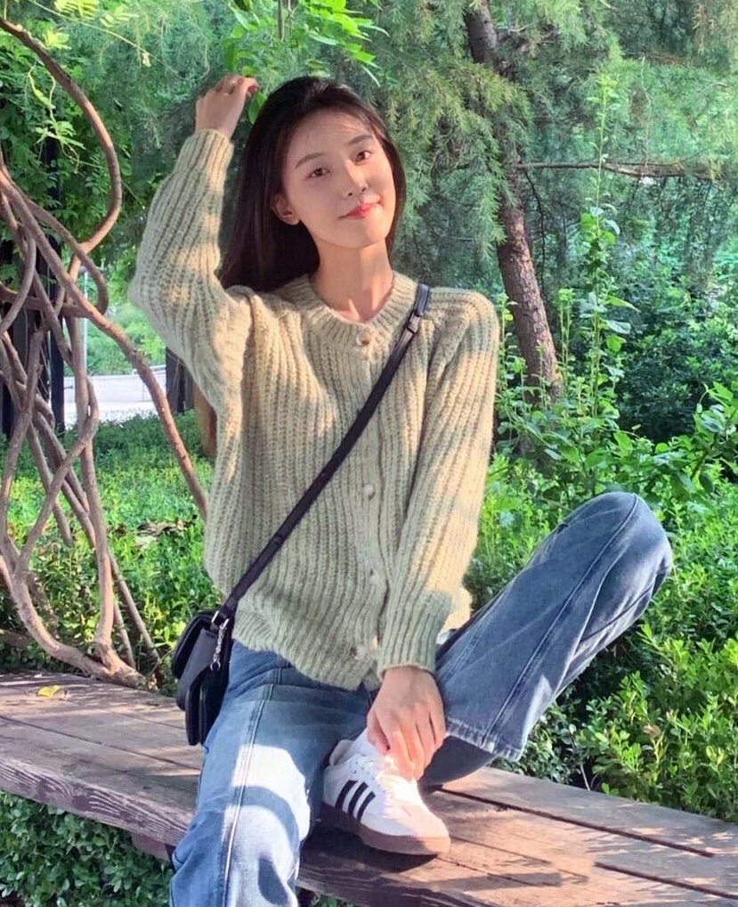 浅绿色针织开衫,搭配减龄时髦的牛仔裤穿搭,简单温柔又有气质。
