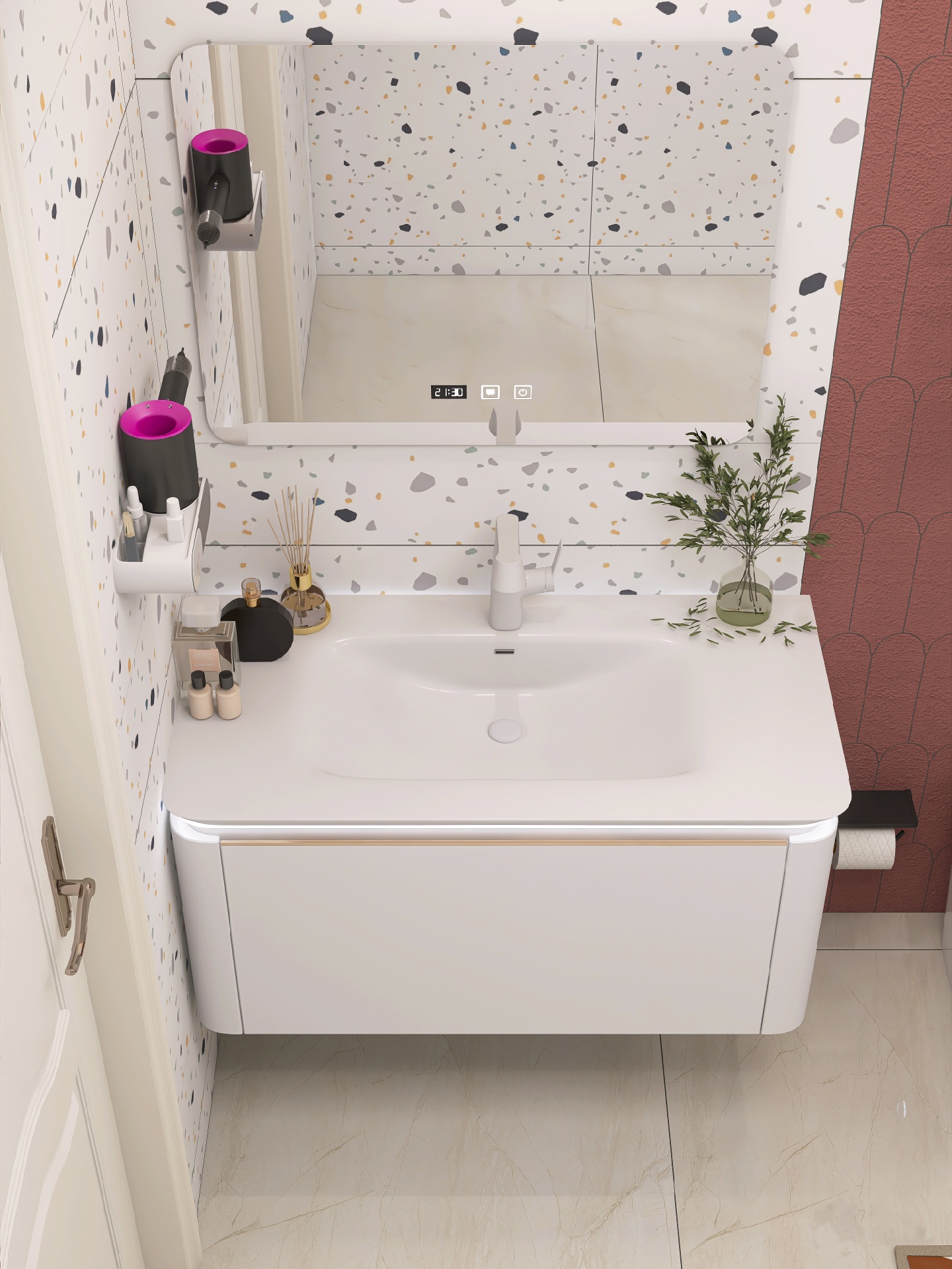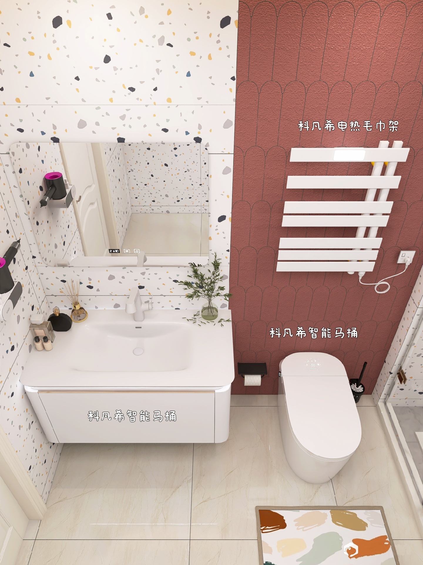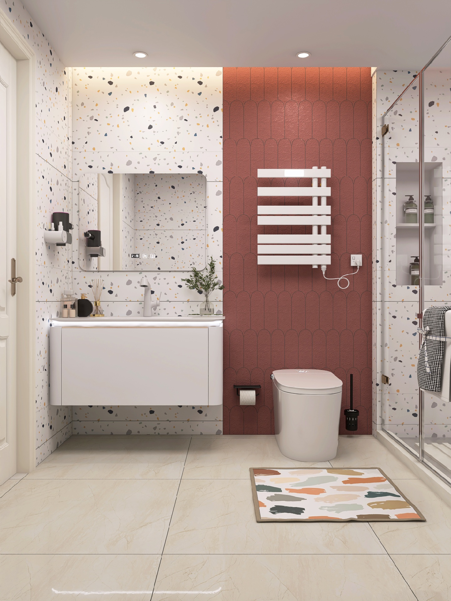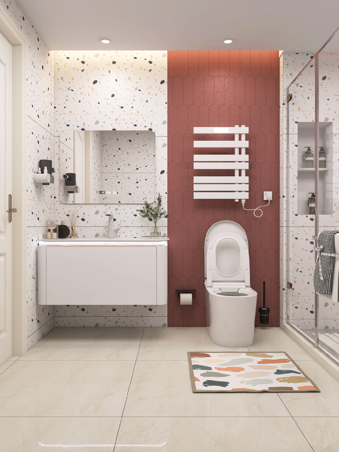 简单干净的水磨石浴室,配上半墙的红鱼鳞瓷砖,纯白的卫浴洁具显得尤为突出,不禁让我想起了“一支红杏出墙来”😂 不,是智能马桶“出墙来”😜