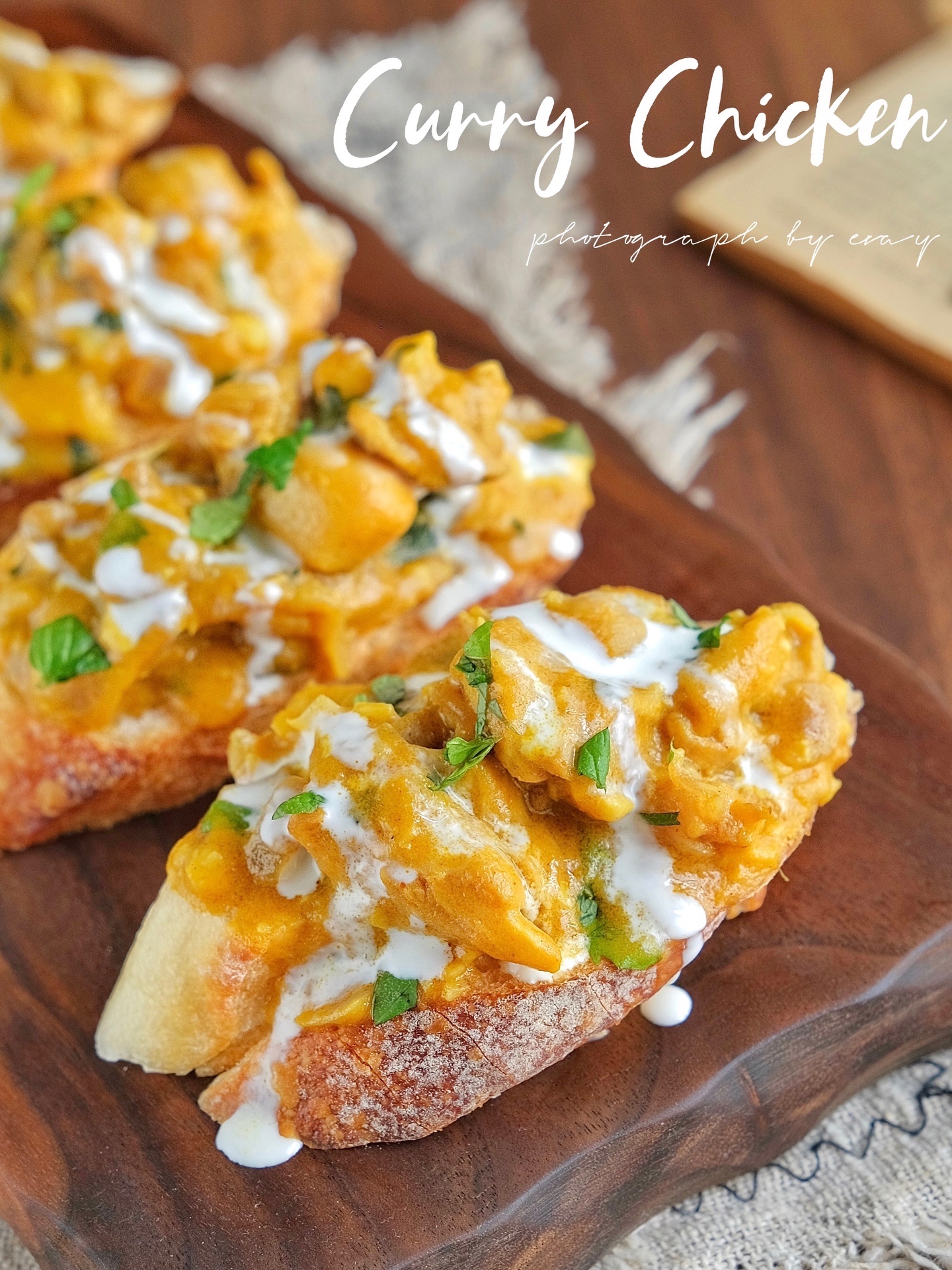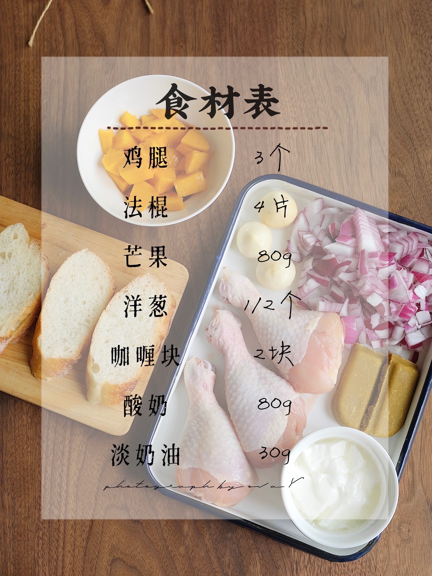 鸡腿3个、法棍4片、芒果80g、洋葱1/2个、咖喱2块、酸奶80g、淡奶油30g、大蒜3个