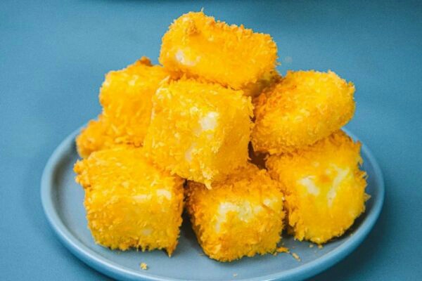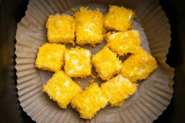 4、切成小块或条状,切好的牛奶块先沾上一层玉米淀粉然后裹上鸡蛋液最后滚上一层面包糠。