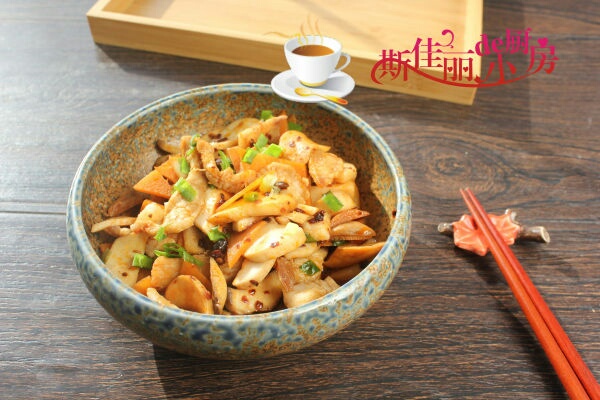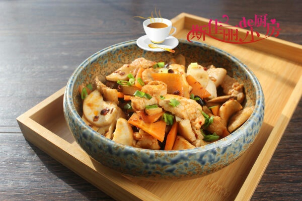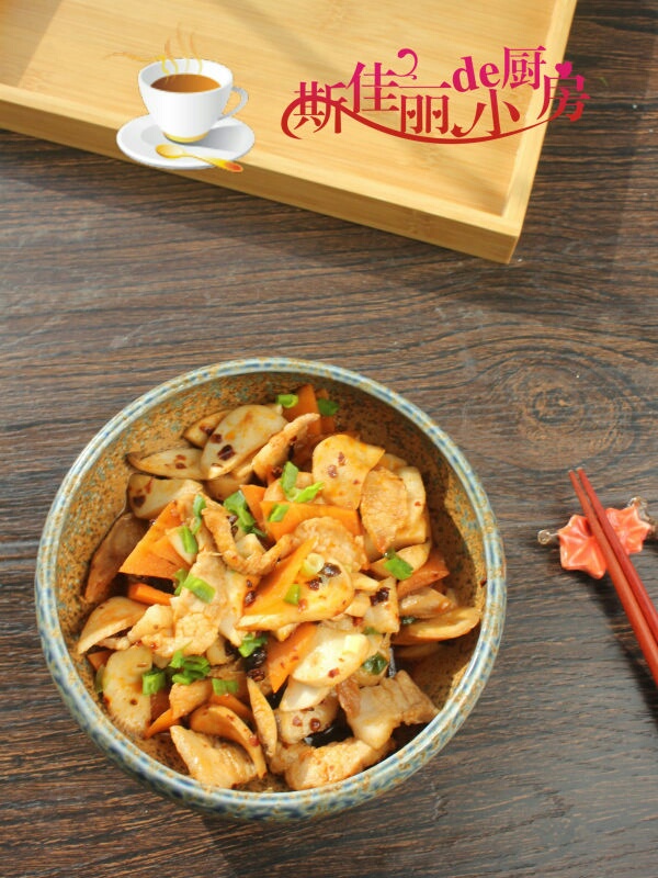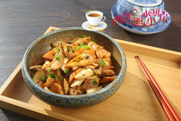 原料: 五花肉 1小块 杏鲍菇 1根 胡萝卜 半根 老干妈豆豉酱 1勺 料酒 1勺 生抽 1勺 葱花 油盐 适量