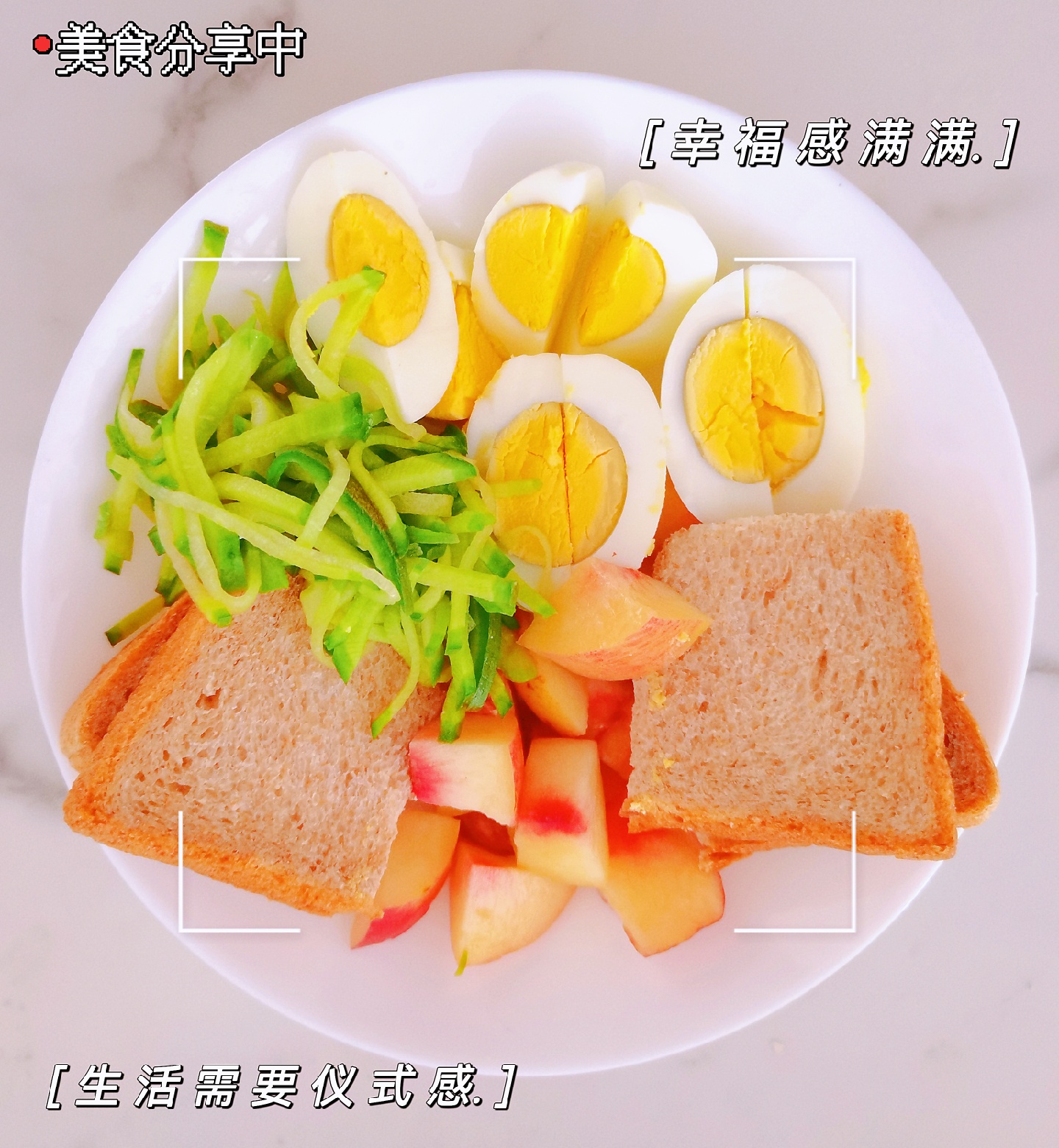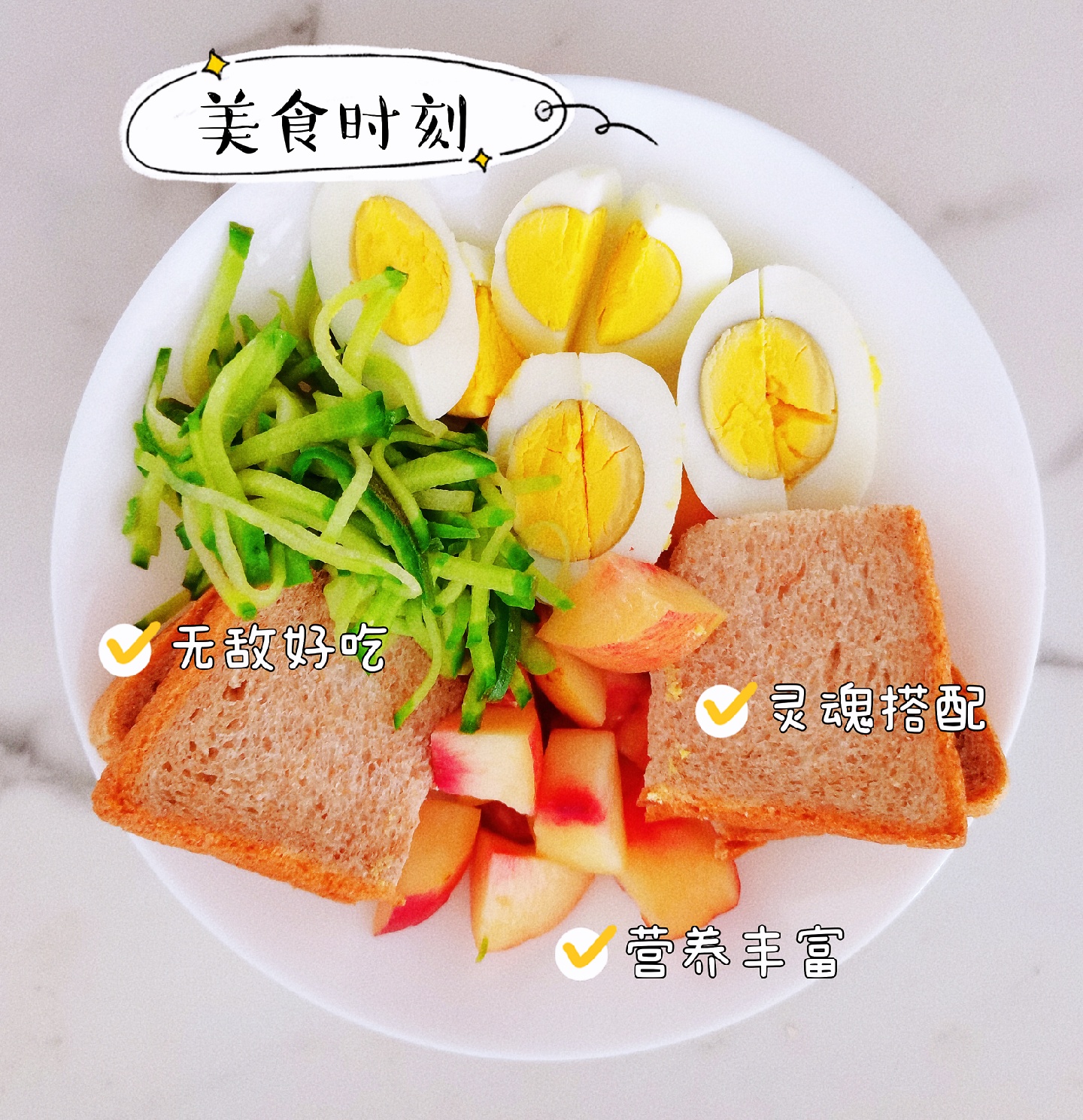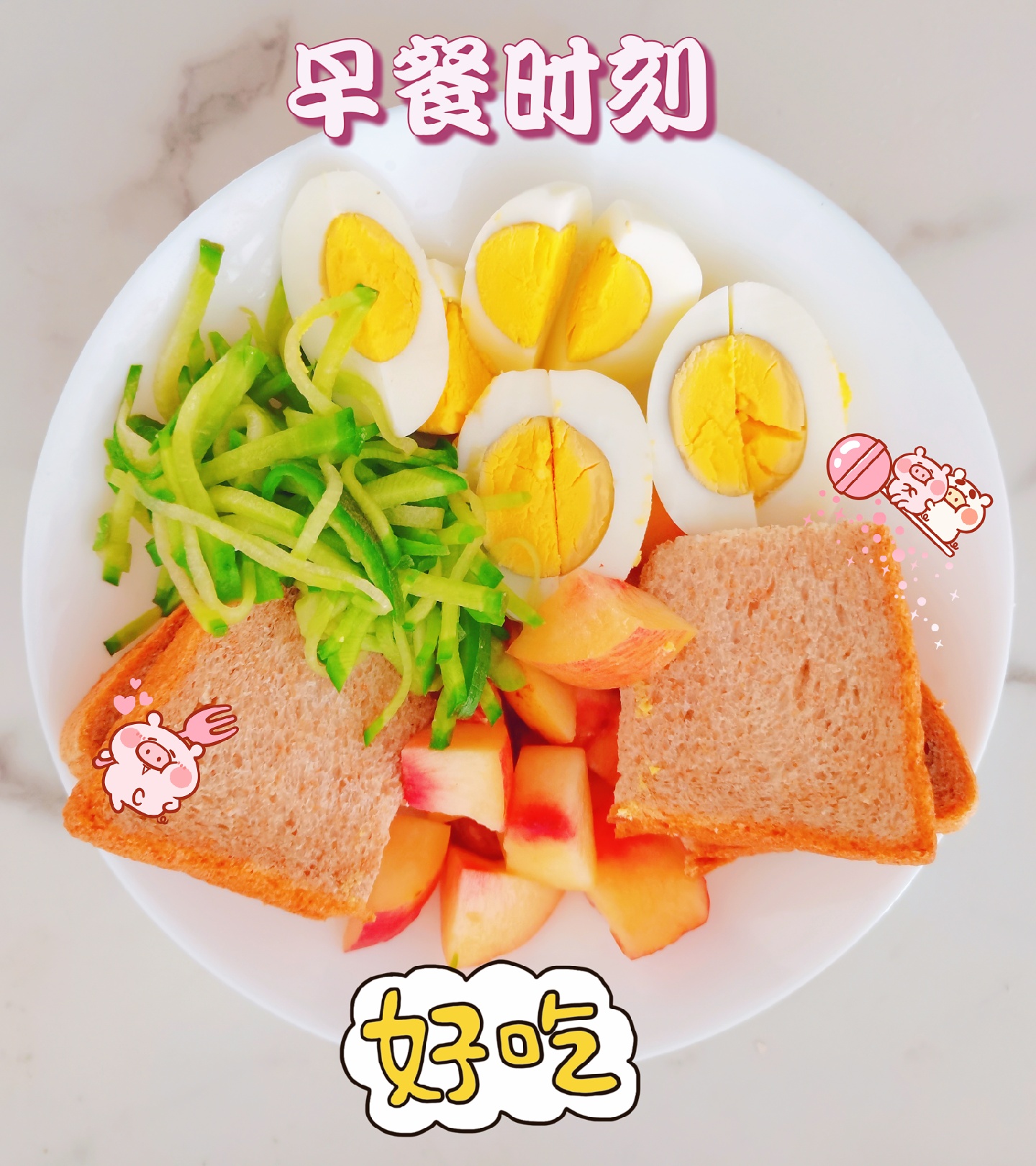 今日早餐分享:碳水是全麦面包片。蛋白质水煮蛋。蔬菜是黄瓜丝和萝卜丝。水果搭配的是冬桃。这样一顿营养早餐就好啦。喜欢的小伙们行动起来吧。