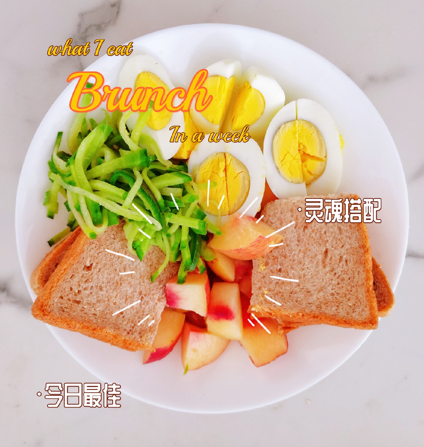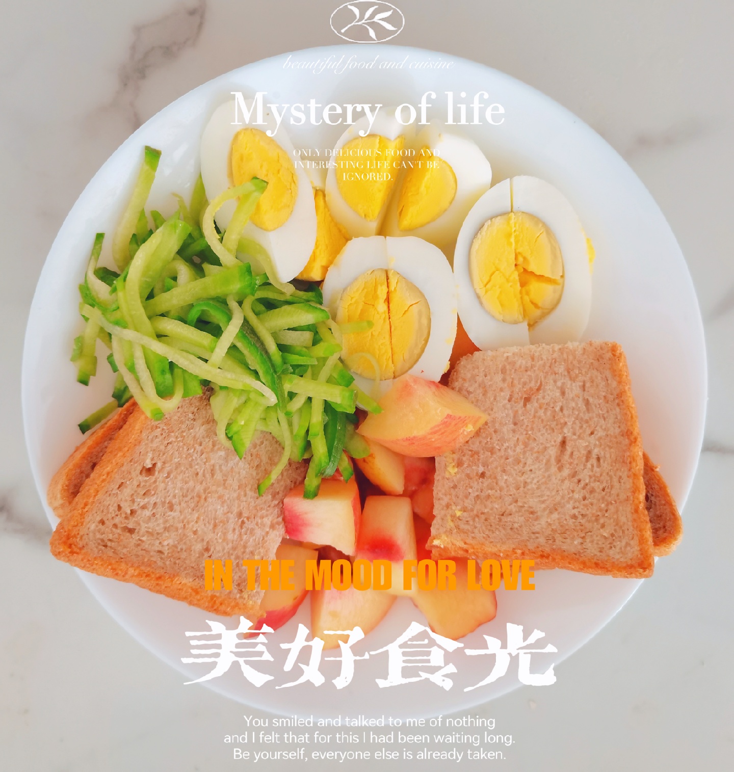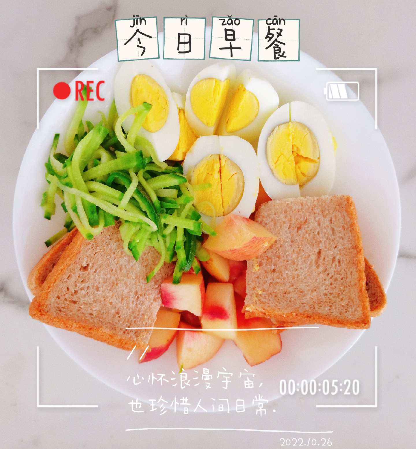 今日早餐分享:碳水是全麦面包片。蛋白质水煮蛋。蔬菜是黄瓜丝和萝卜丝。水果搭配的是冬桃。这样一顿营养早餐就好啦。喜欢的小伙们行动起来吧。