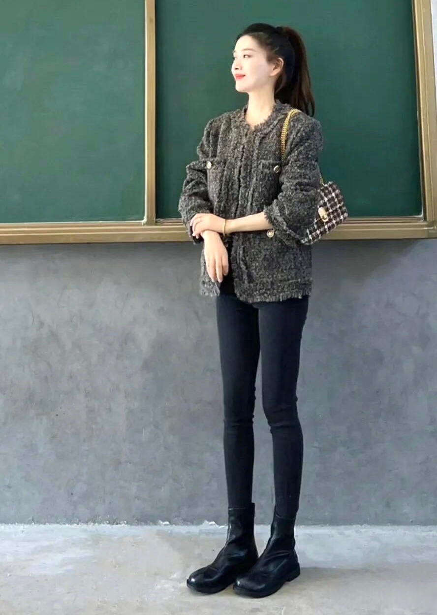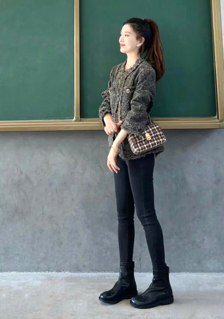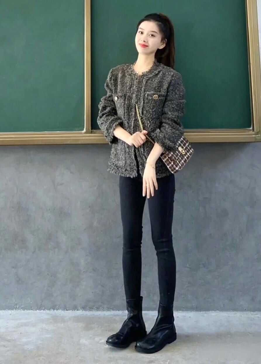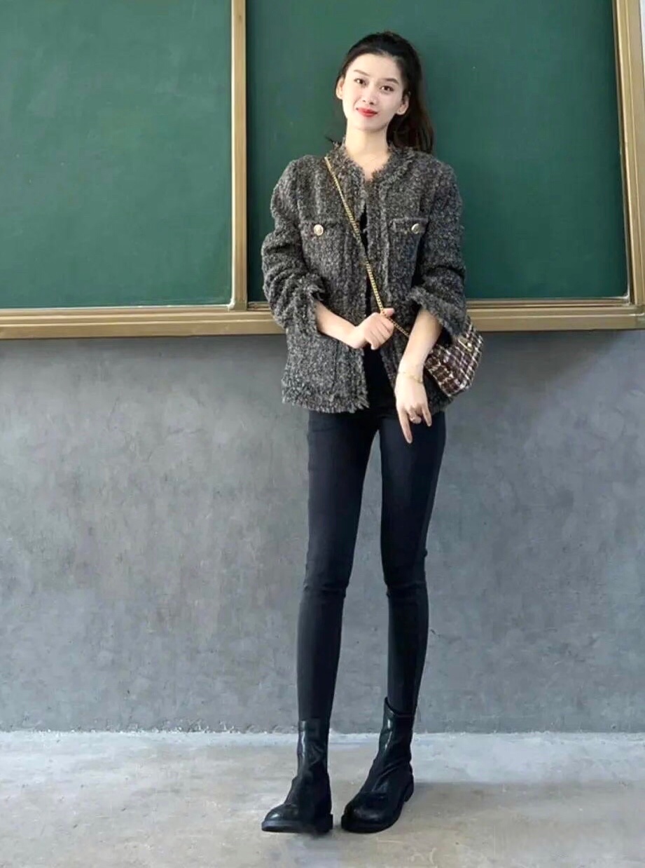 小香风外套和黑色紧身裤的搭配真的是特别显腿长,有足够的贵气精致。