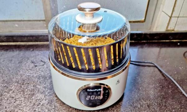 3.准备一台空气炸锅,将鸡肉丝平铺在锅中,将空气炸锅的温度调为180度,烤20分钟,中途可以翻动一下,使其受热均匀,将鸡肉丝烤至酥脆,即可出锅。