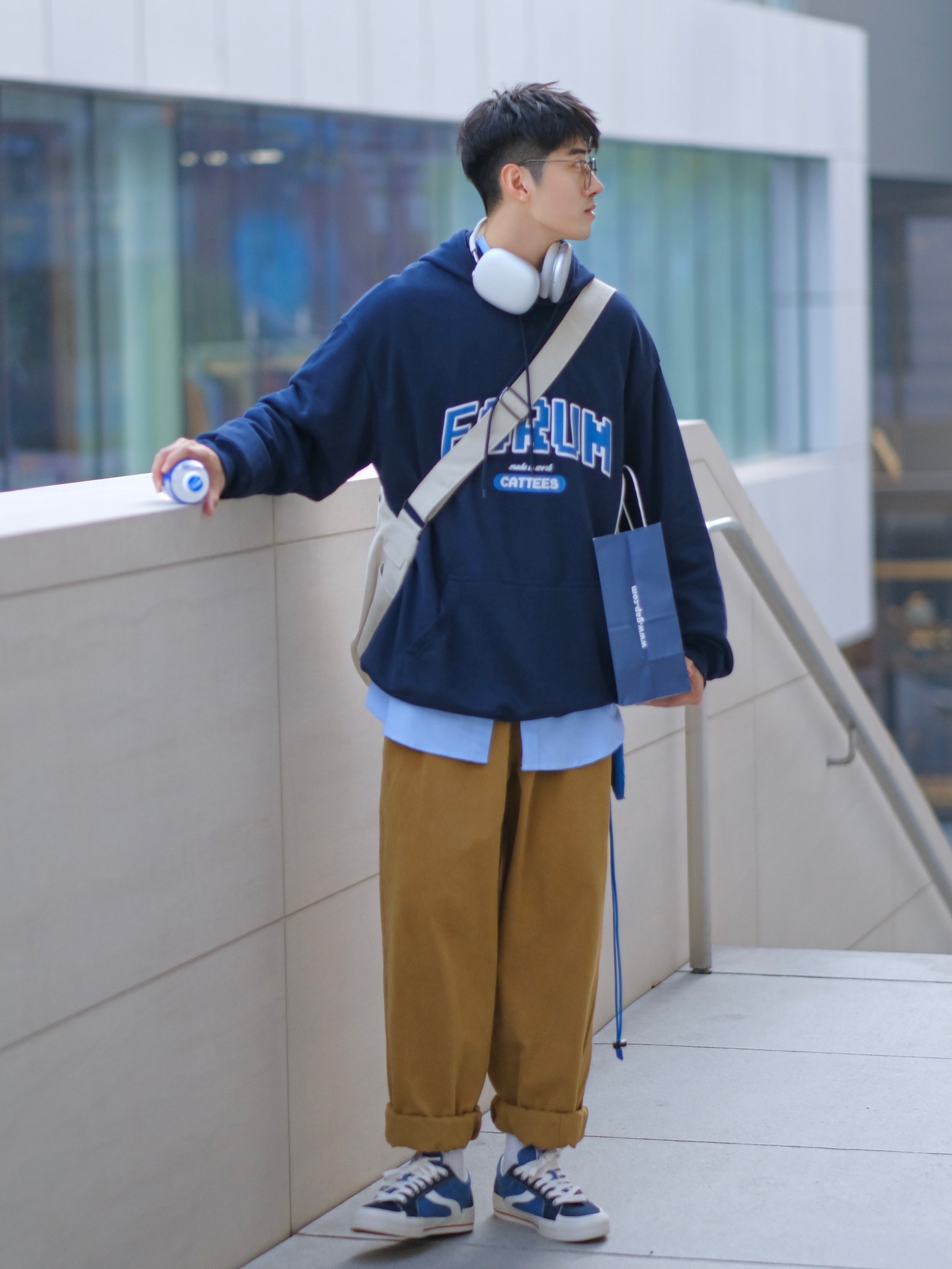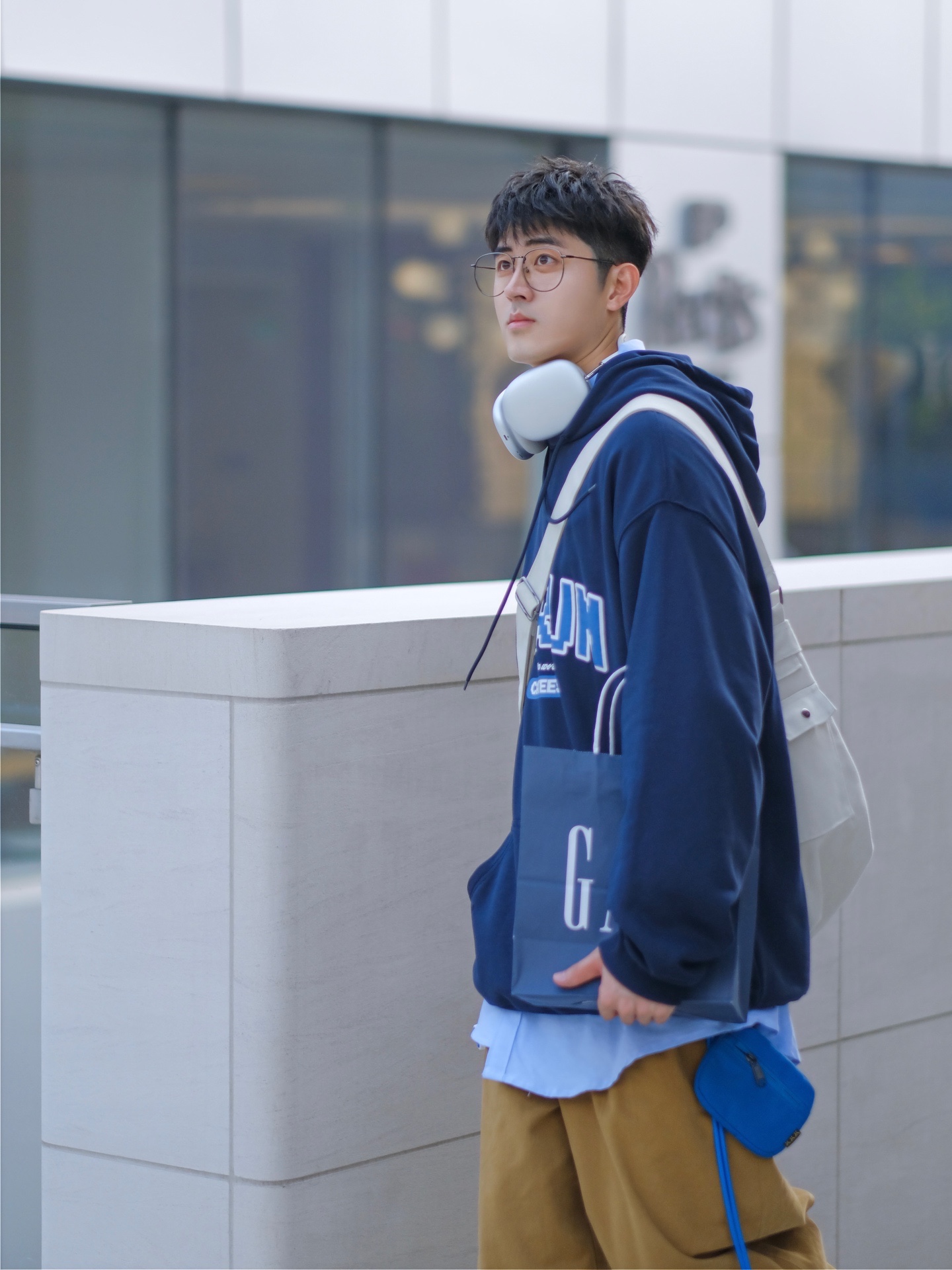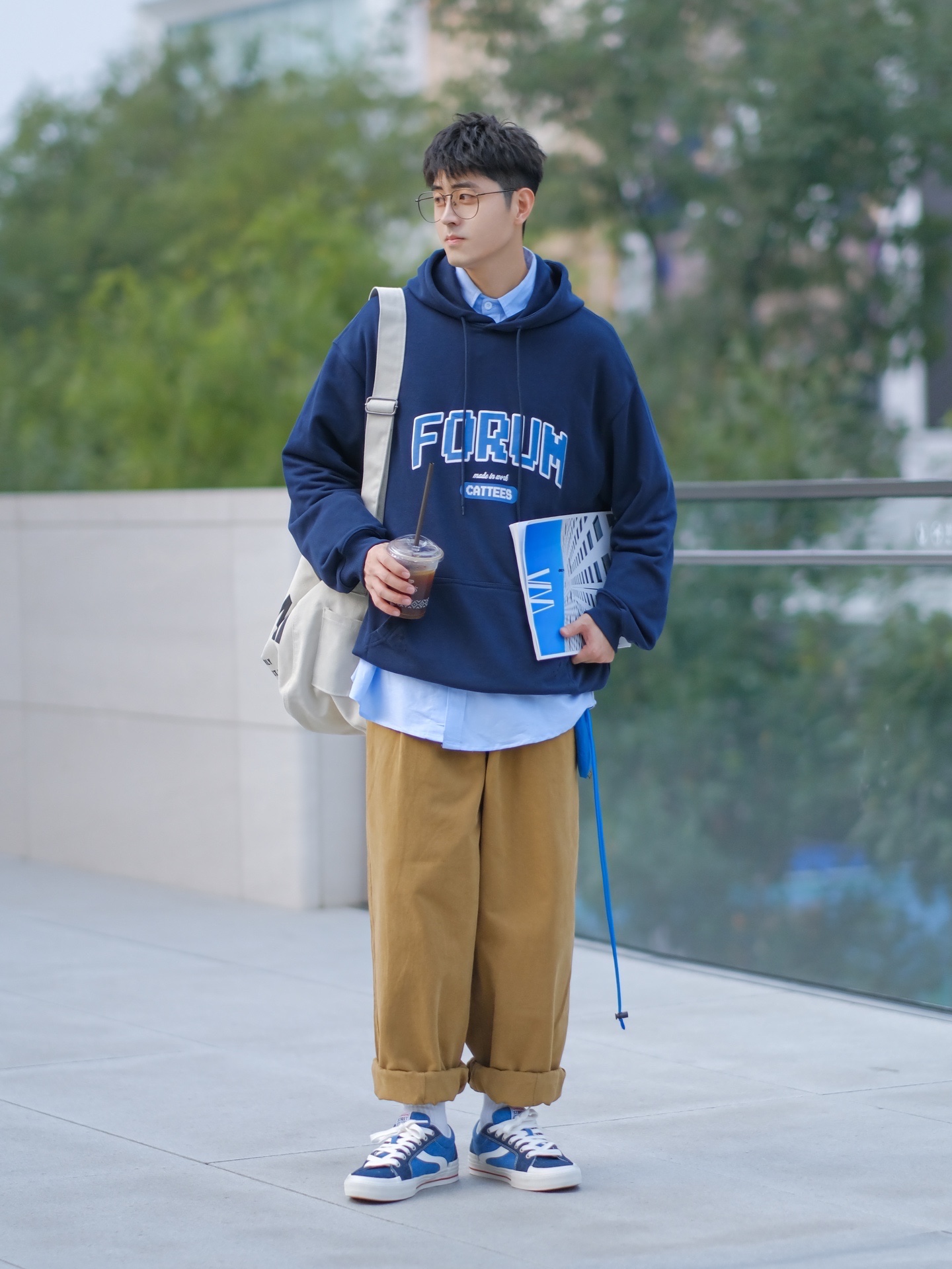🔹【藏青色】搭配【卡其色】!就是喜欢这种干干净净的“日系穿搭”!满满的少年感穿搭!真的好适合男生秋季穿搭!关于男生卫衣穿搭,秋冬打底来一件衬衫,可以增加视觉层次感哦!