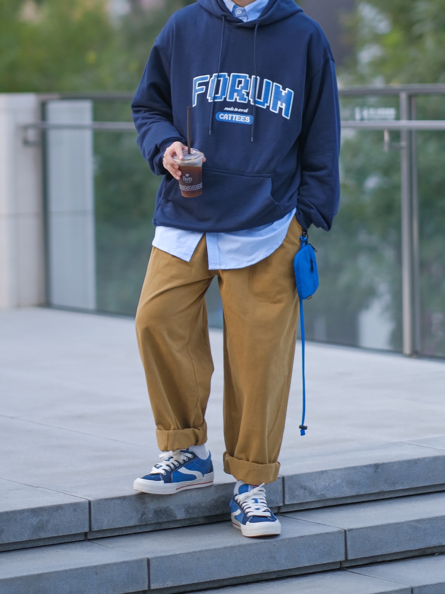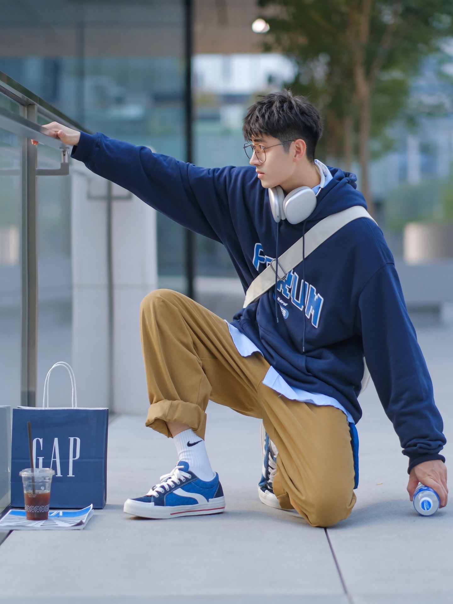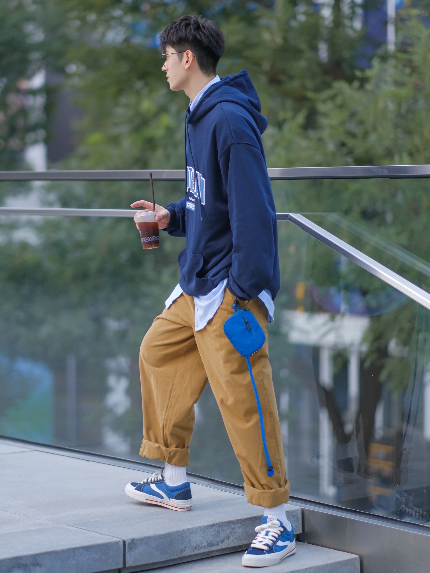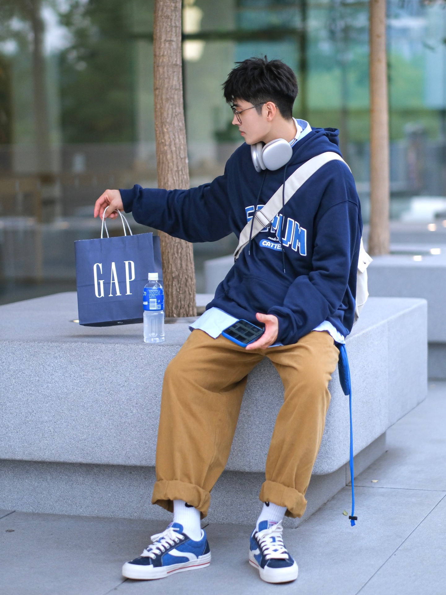🔹【藏青色】搭配【卡其色】!就是喜欢这种干干净净的“日系穿搭”!满满的少年感穿搭!真的好适合男生秋季穿搭!关于男生卫衣穿搭,秋冬打底来一件衬衫,可以增加视觉层次感哦!