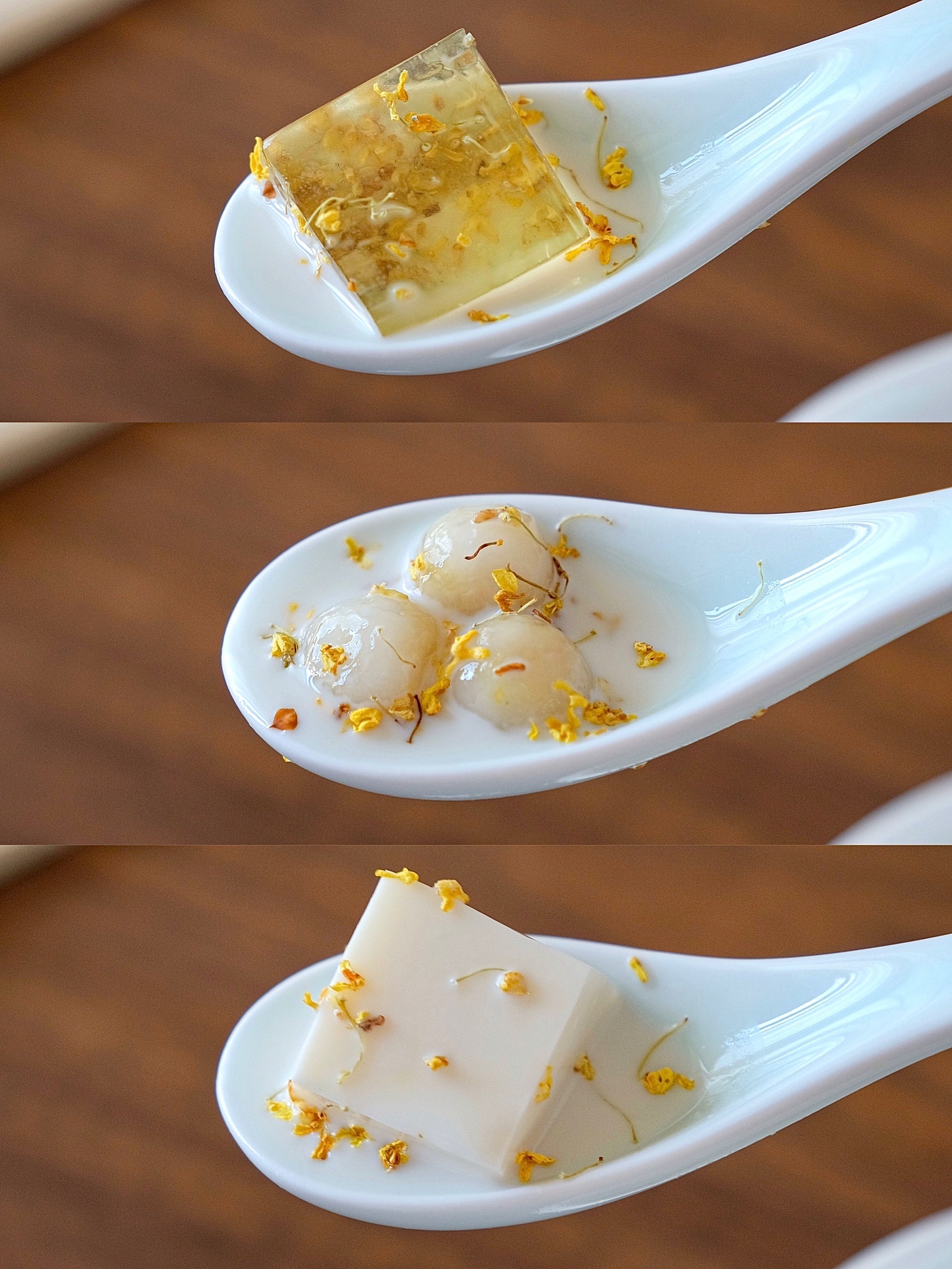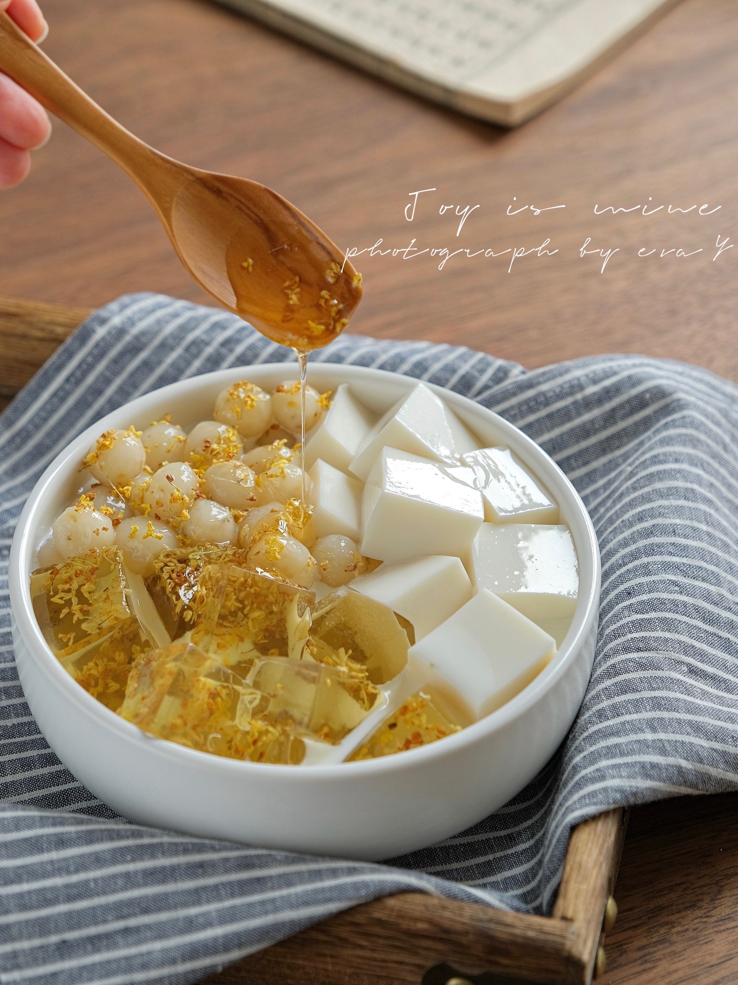 把凝固好的奶冻切成小方块,把它们组合起来,淋上牛奶或椰奶,加点桂花蜜就可以开吃了。