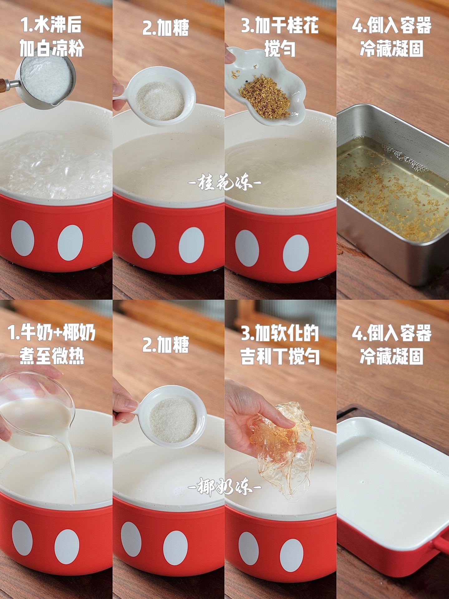 牛奶+椰奶煮至微热,加糖+软化后的吉利丁搅匀,倒入容器冷藏凝固