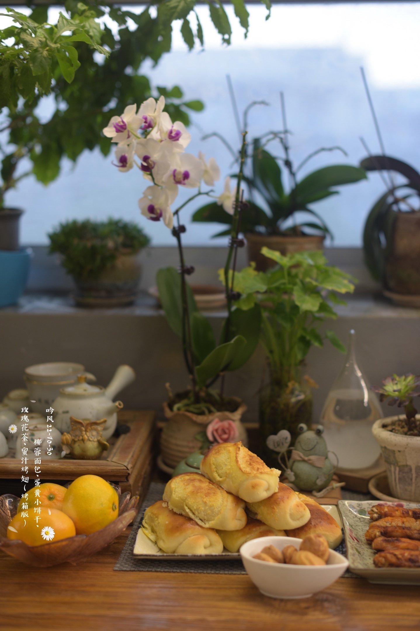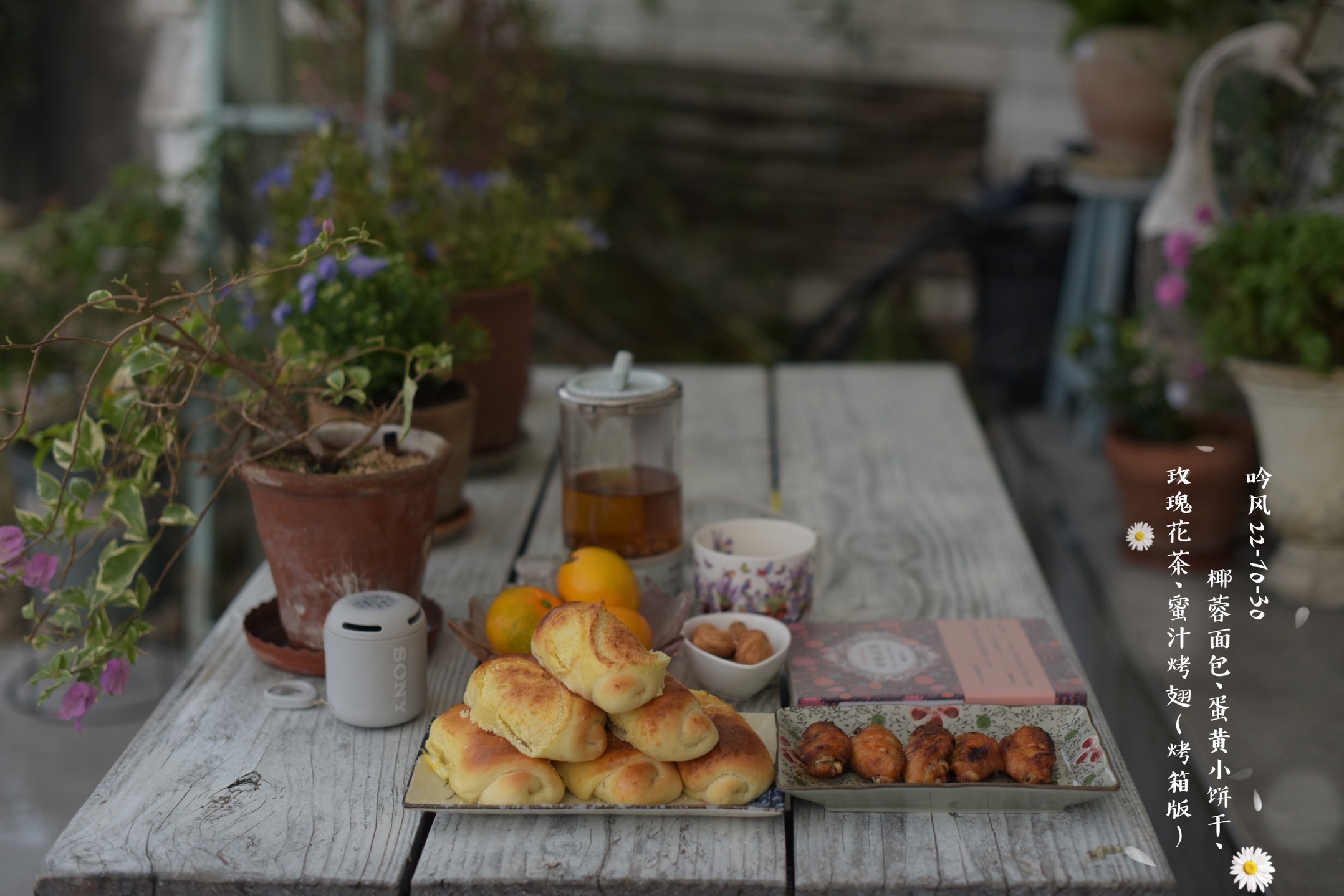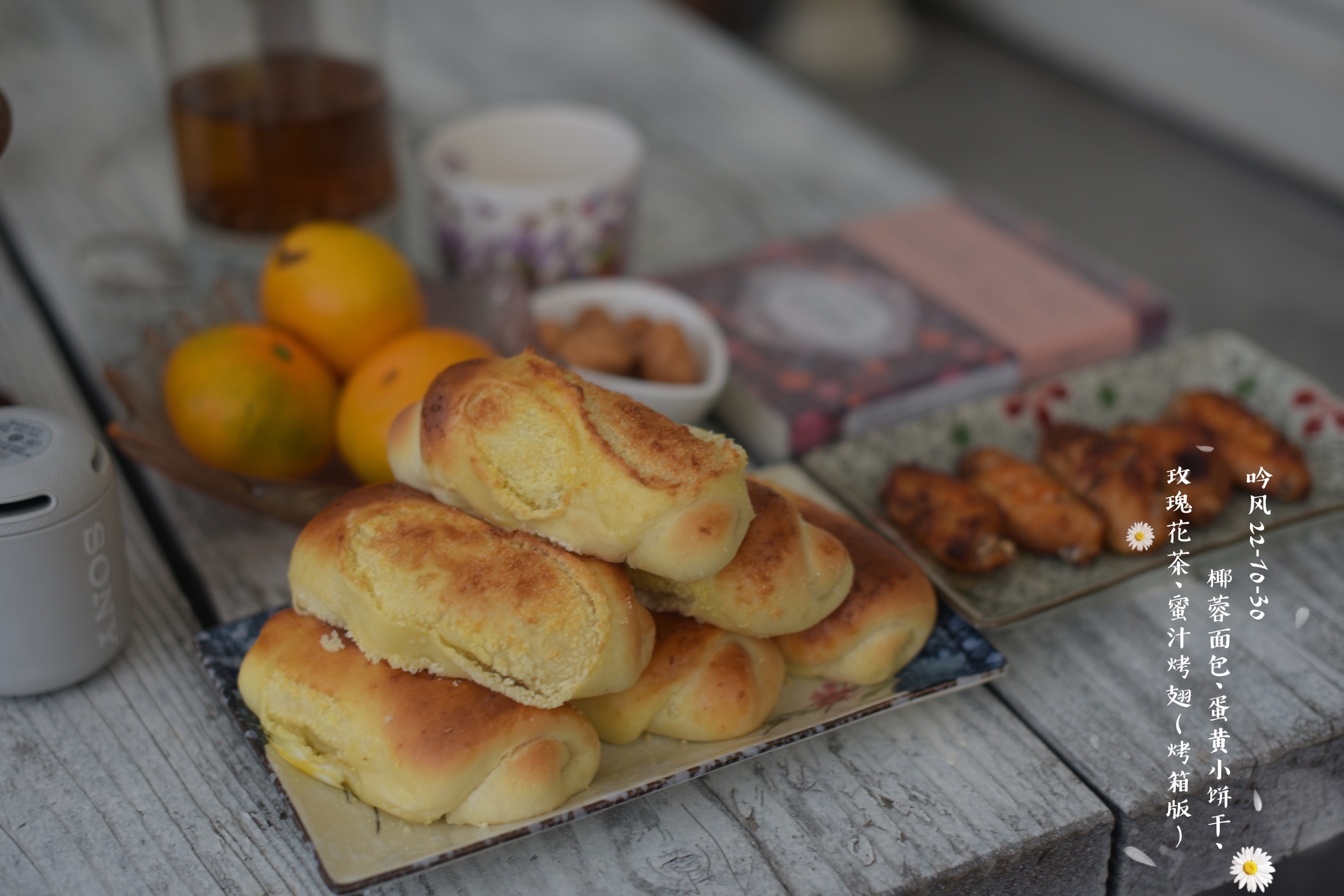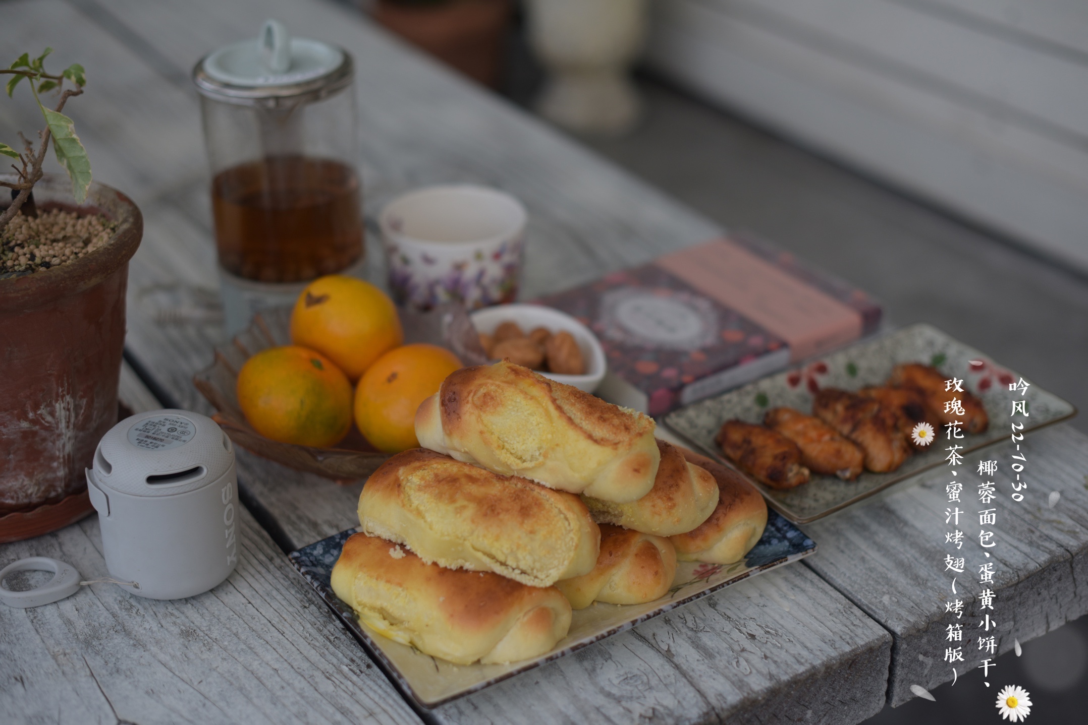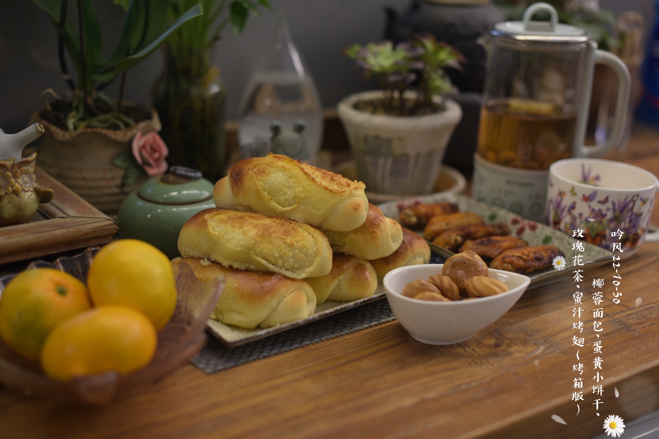 整整一天厨娘:做了:椰蓉面包、蛋黄小饼干、蜜汁烤翅(空气炸锅版,成品有焦迹,不如烤箱烤的漂亮,味道还是不错的),煮了一壶玫瑰茶。