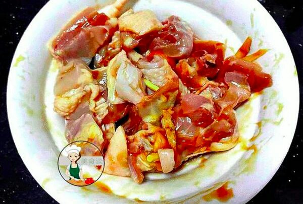 4、鸡肉洗净切块,加入生姜丝、生抽、蚝油混合一起拌匀腌制20分钟入味待用。