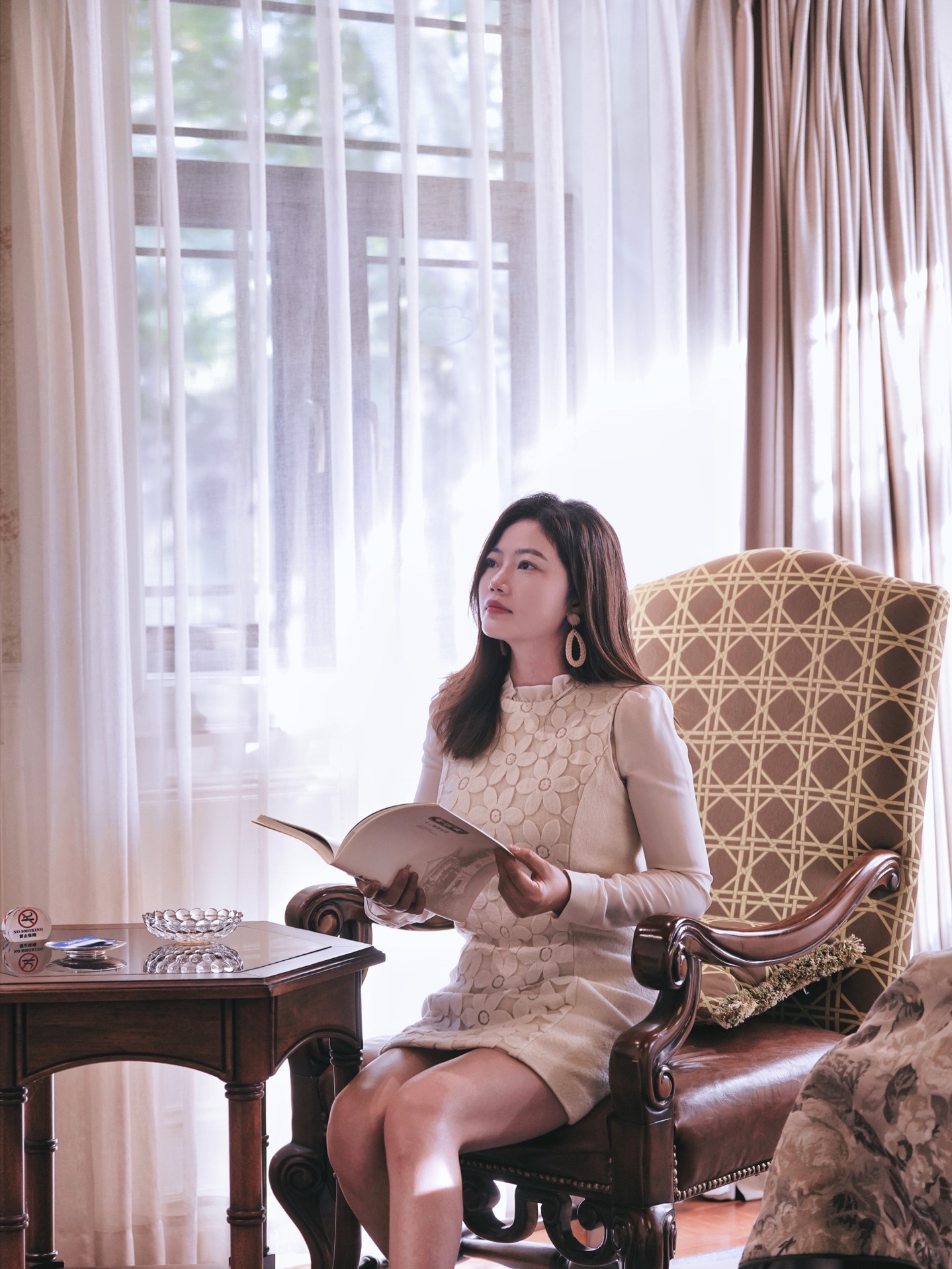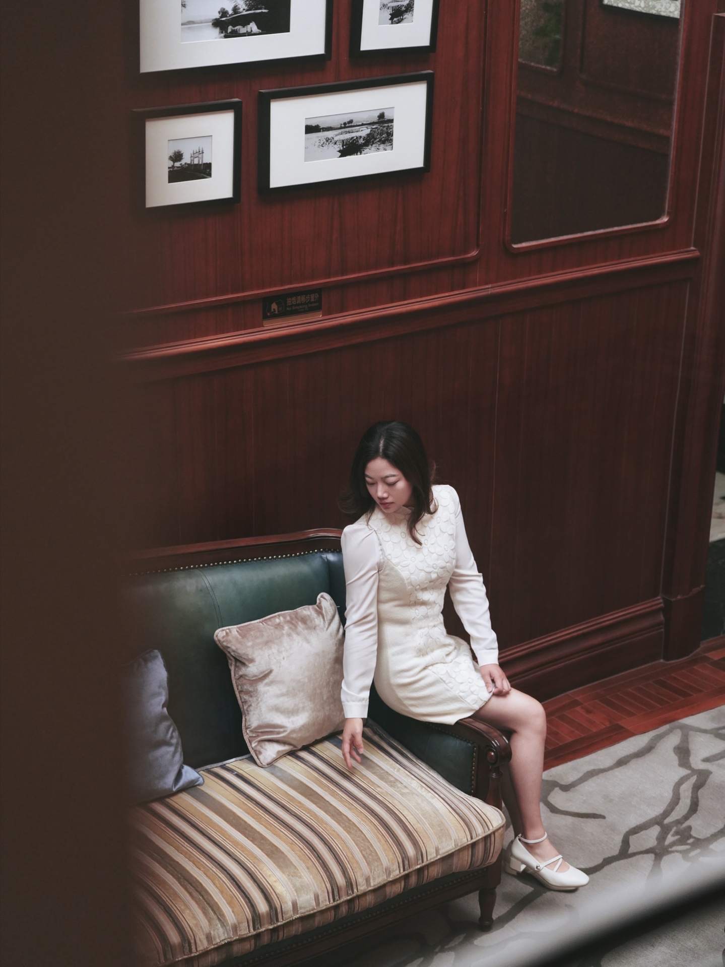 🌟客厅:从二楼小窗里俯拍客厅,人坐在沙发上,超有民国电视剧的范儿,找点前景虚化还能拍出偷窥感。
