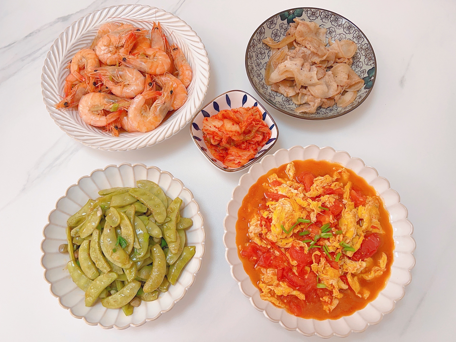 🍅爆炒基围虾、番茄炒蛋、泡菜五花肉、清炒扁豆#家常菜抚人心。给喜欢的花花拍拍照,朱丽叶和长相思着实养眼呢。