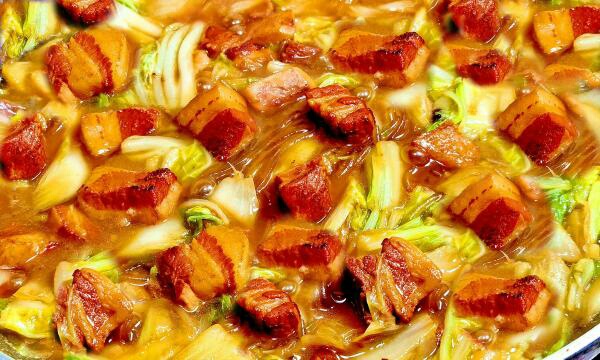 3.五花肉炖至软烂后,加入适量的盐调味,搅拌均匀后,再炖5分钟,红烧肉就炖熟了,如果喜欢单独吃红烧肉,这时候就可以出锅食用了。取一把红薯粉条,冲洗干净后,用温水泡软,然后捞出,放入锅中,埋进汤里,取一棵白菜,将白菜叶掰下来,清洗干净后,撕成大块,放入锅中。