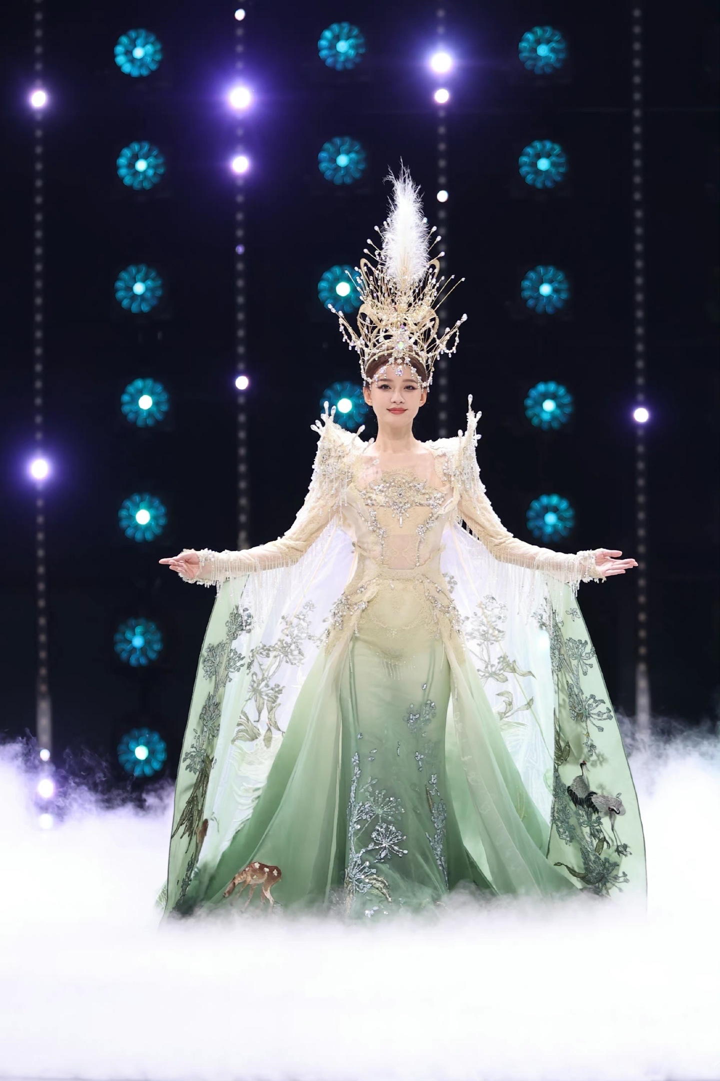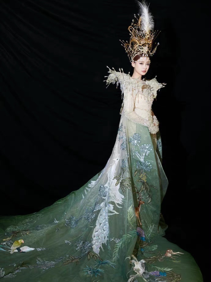 裙上绣满了熊猫、小鹿,仿佛穿了整个大自然,