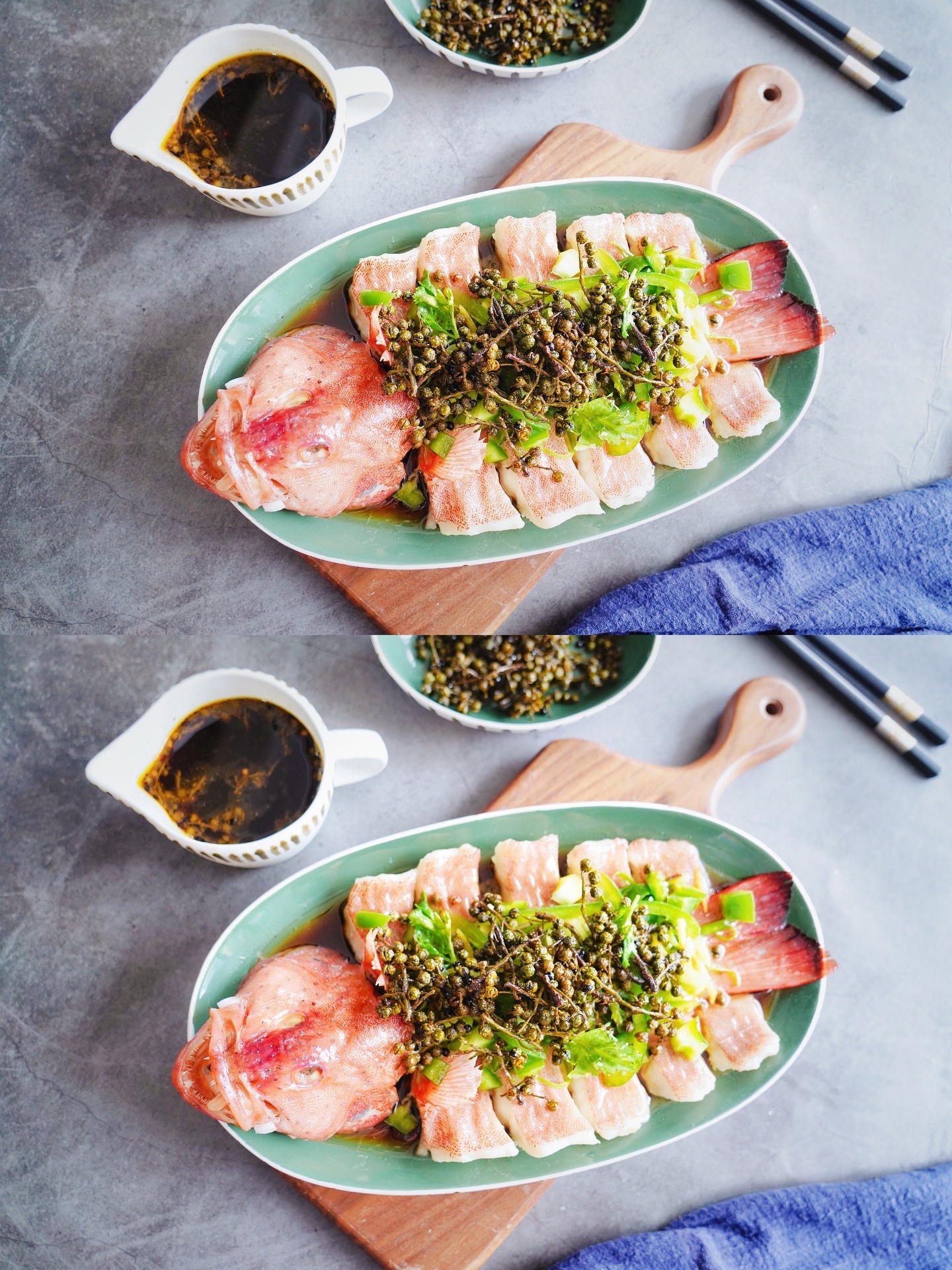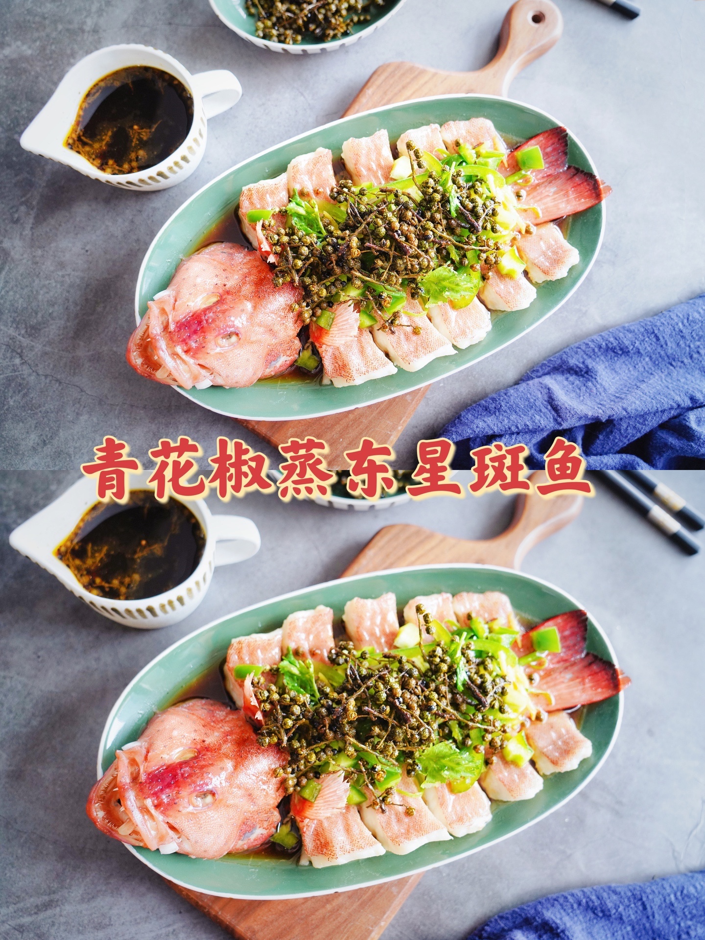 2、东星斑蒸好后要把鱼腥汤倒掉,再淋入青花椒酱汁和热油,不然腥味会很重,影响口感