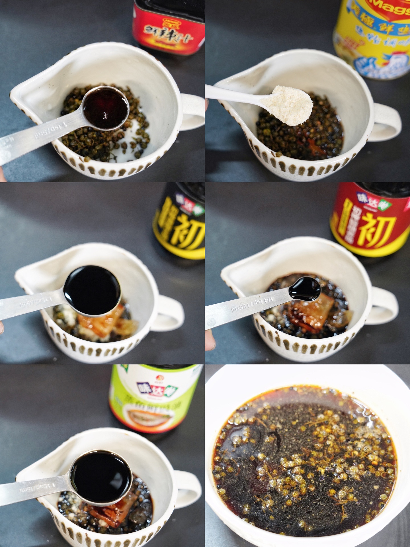 7、把拍散的花椒放入碗里,加入香菜末、鲜辣汁、生抽、老抽、蒸鱼豉油、黄冰糖