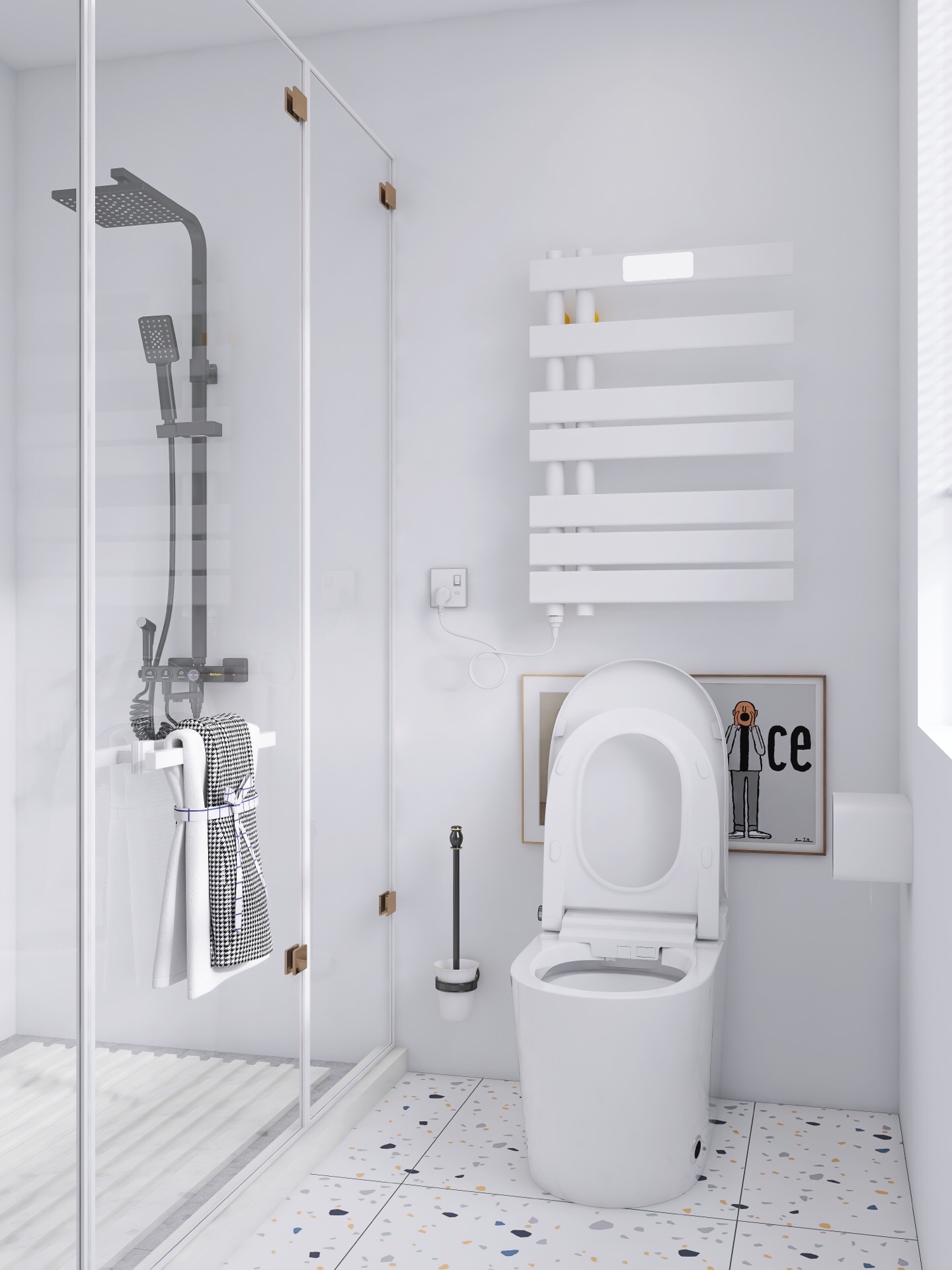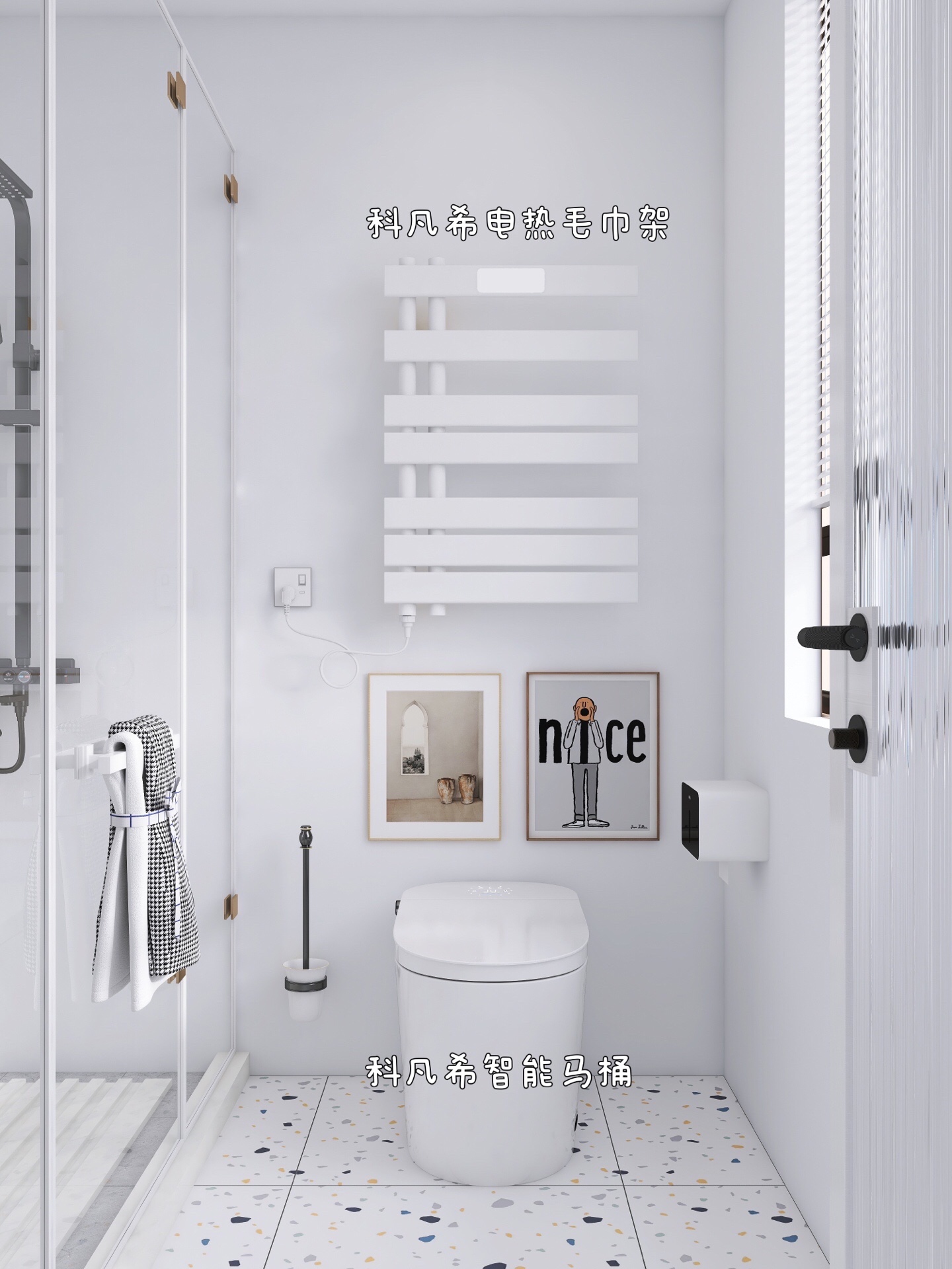 🌾 马桶上方的是电热毛巾架。同样小巧却智能的身躯,能为毛巾烘干/杀jun/消毒,铝制机身,防水防电,十分环保🍃 🍃 🍃