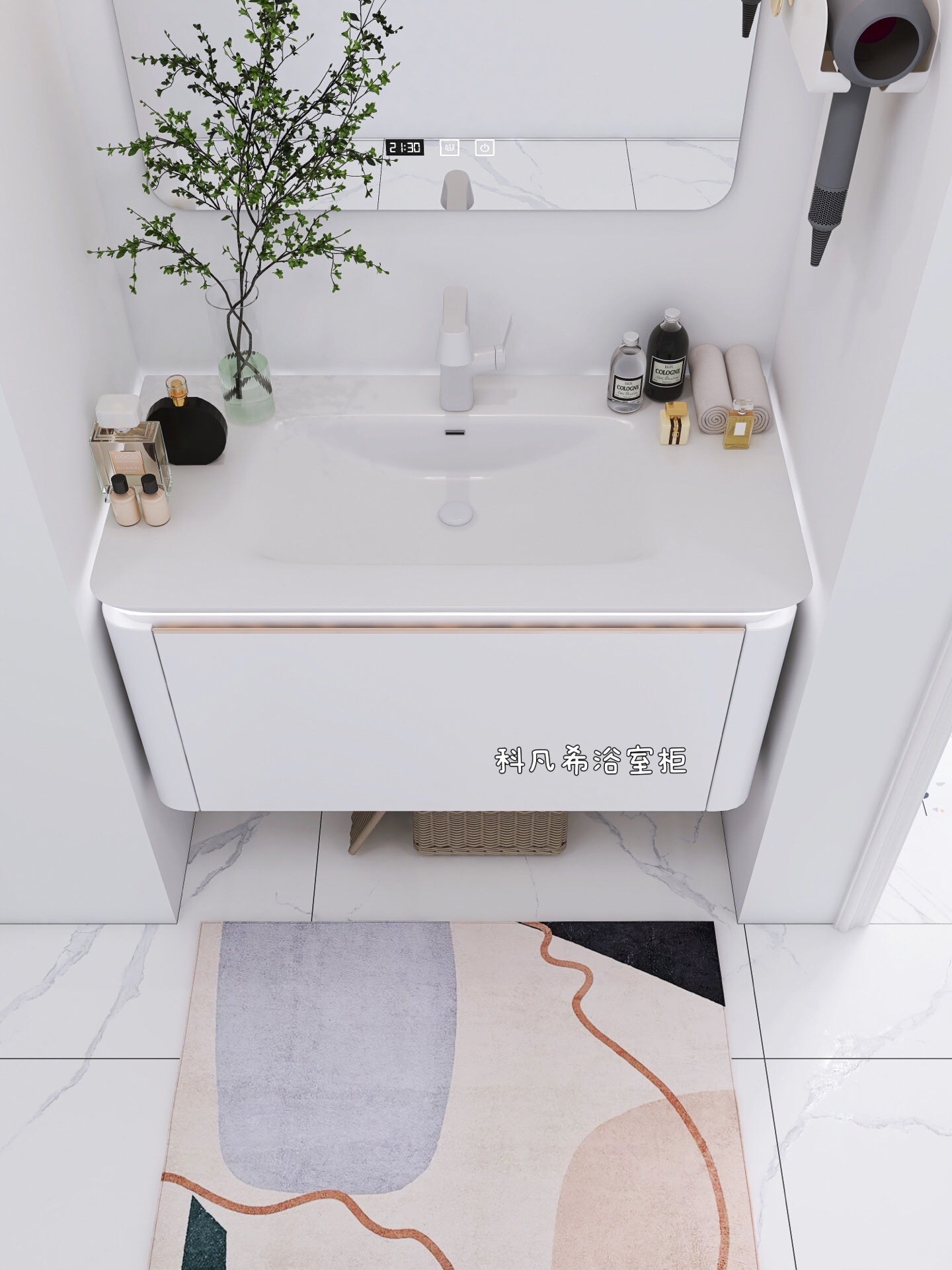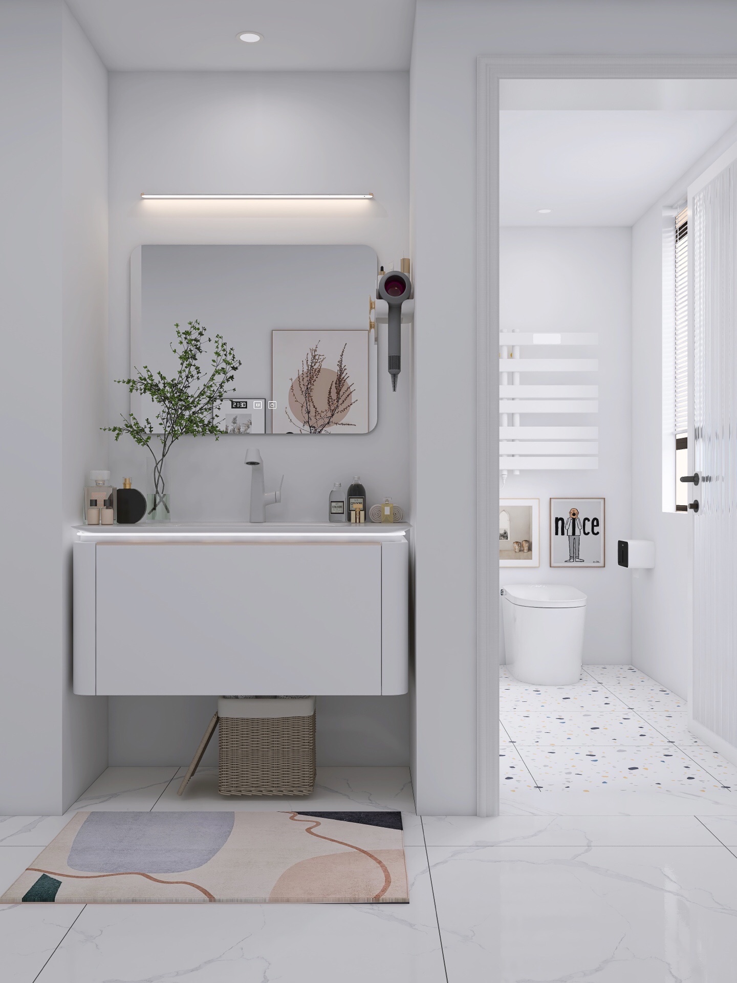 🌾门口的智能浴室柜,纯白洁净,大方优雅✨ 悬挂式的柜子,实木但稳重✊ 琦美石的台面,很有质感!旁边放一簇绿植,百搭清新又养眼~