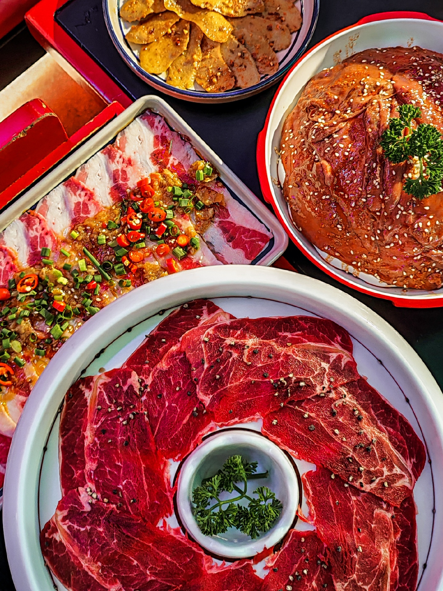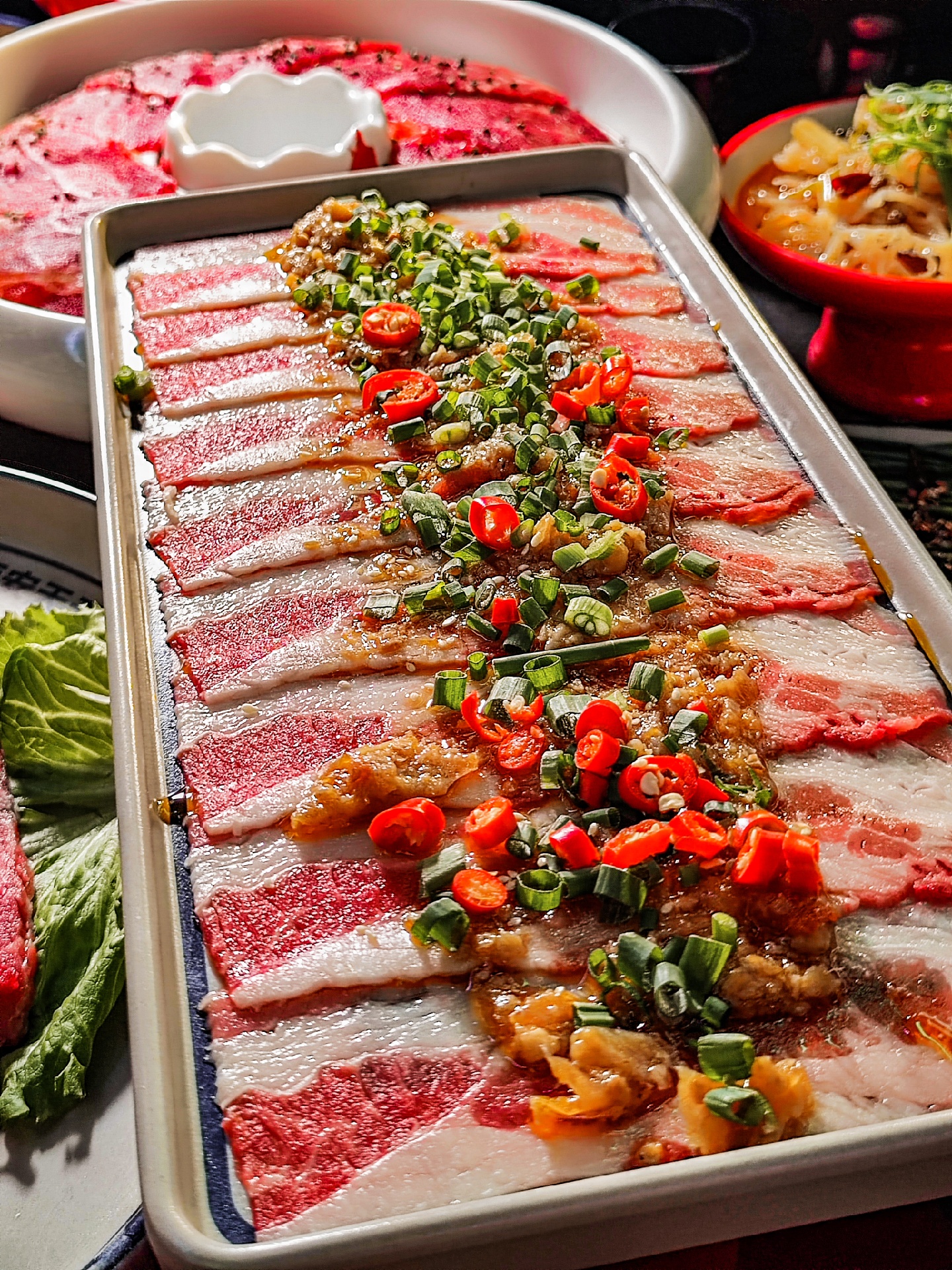 |泡椒雪花肥牛^肥瘦相间的雪花肥牛,用特色泡椒腌制,非常入味,烤出来裹着生菜吃简直不要太香,确实嘹咋咧[呲牙]