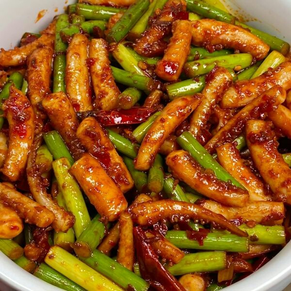 准备食材:鱿鱼须,蒜苔,葱,姜,料酒,干辣椒,豆瓣酱