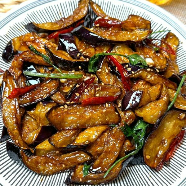 4、锅里加油,油热加入蒜末干辣椒炒香,倒入料汁炒至浓稠,下入茄子和香菜翻炒均匀,美味即成。