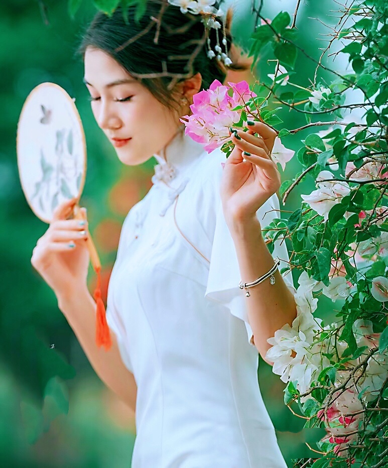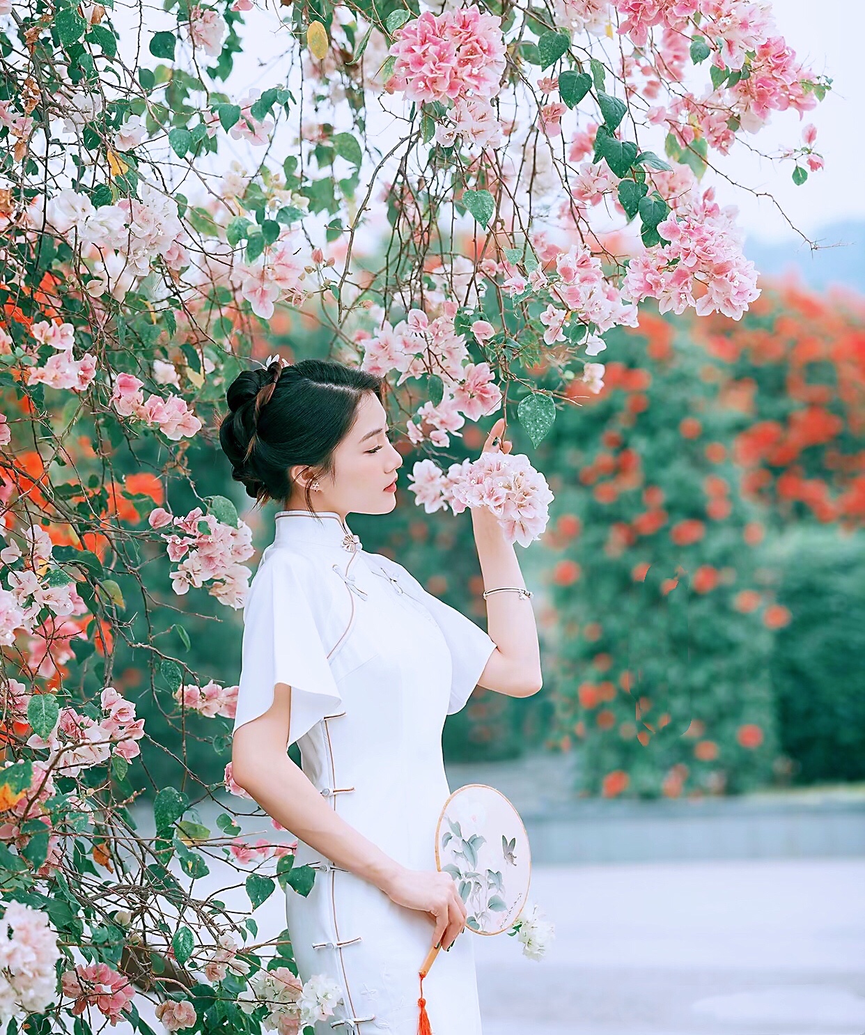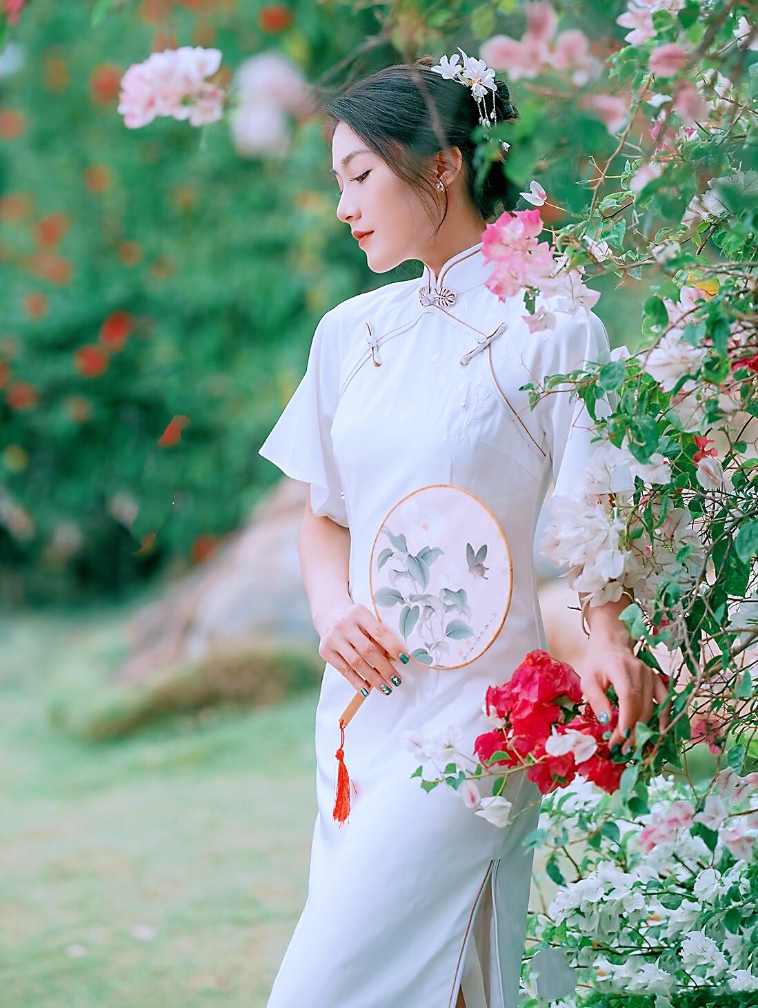美女模特穿的是一套白色旗袍,配白色的三角梅,感觉应该还行。