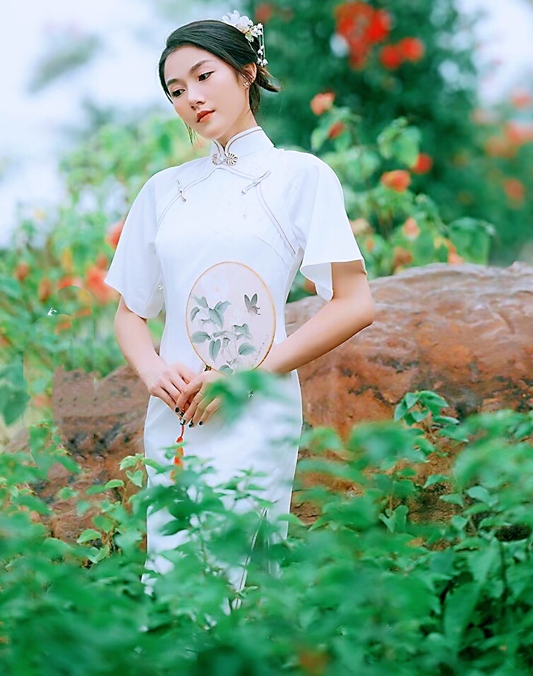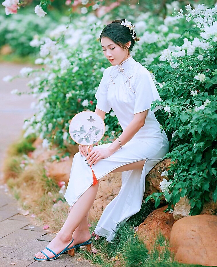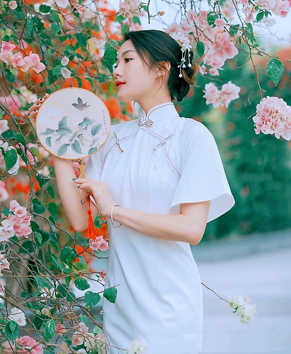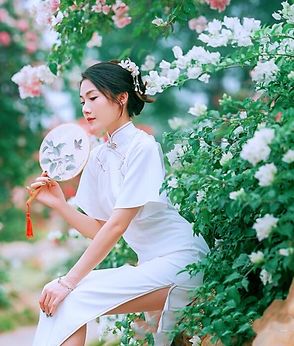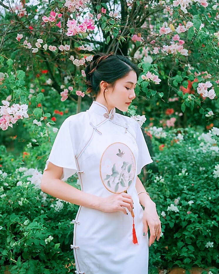 美女模特穿的是一套白色旗袍,配白色的三角梅,感觉应该还行。