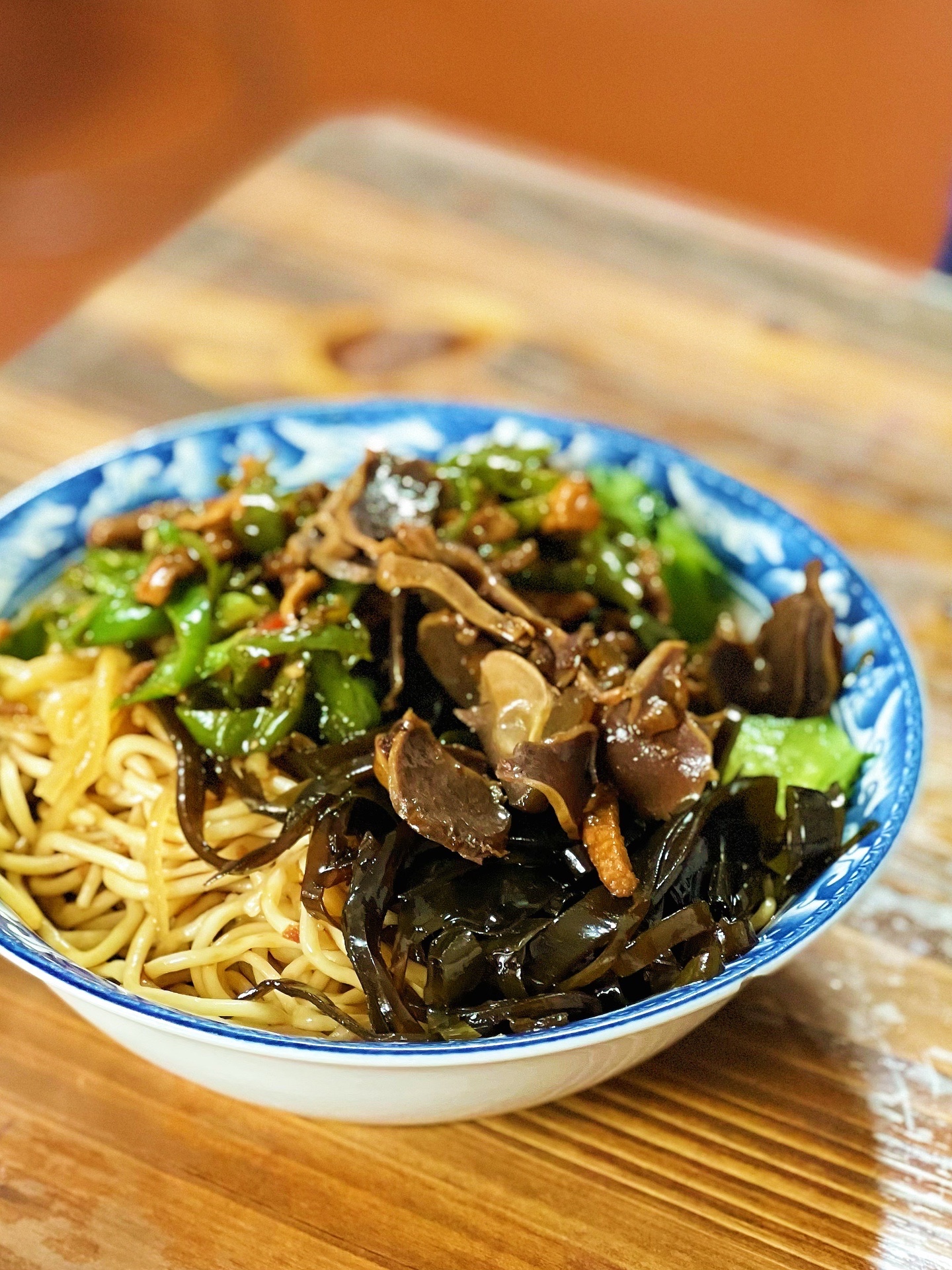 🍒「荤拌凉面」和街边那种顶着黄瓜丝的凉面不太一样,更像盖浇凉面。面上的浇头很丰富,青椒肉丝,干子,鸭胗,海带丝,都是熟的凉菜。吃起来更像凉的拌面,酱香口的,味道很自然温和,非常好吃。