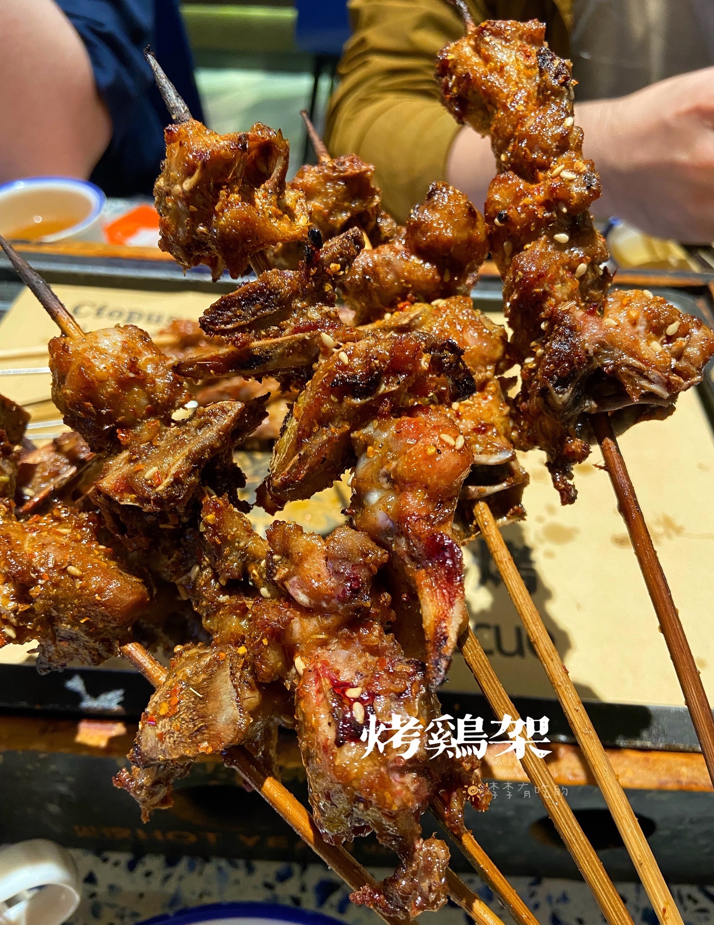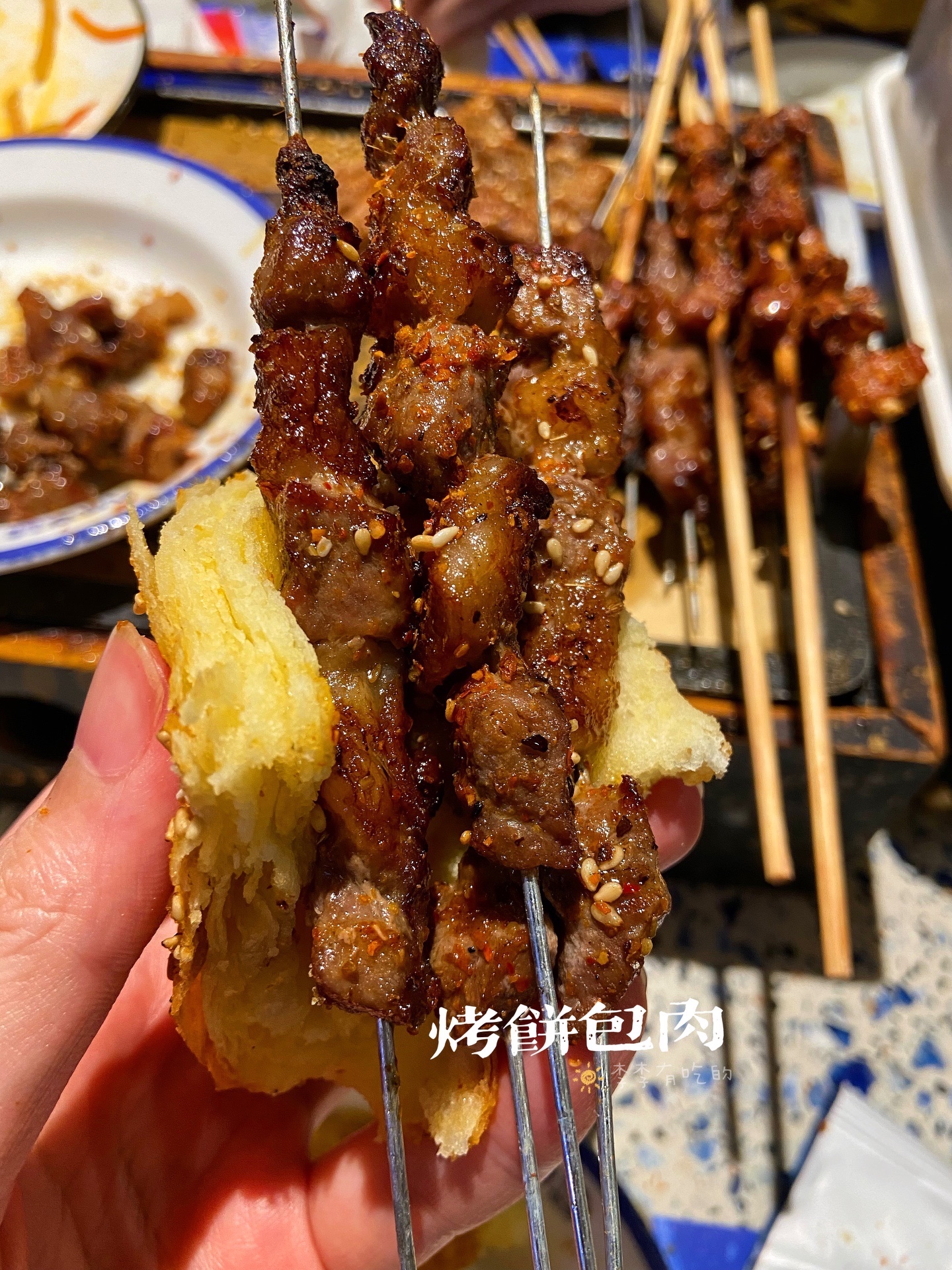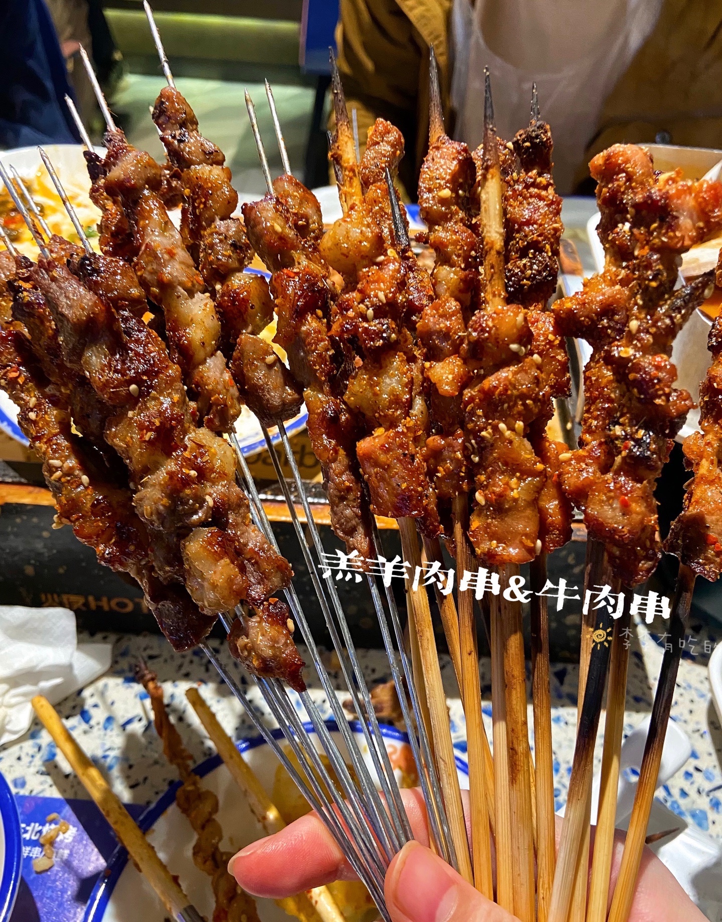 「老味牛肉串」牛肉烤得刚刚好不老,必须一上桌就吃,保温板放久了就老了。