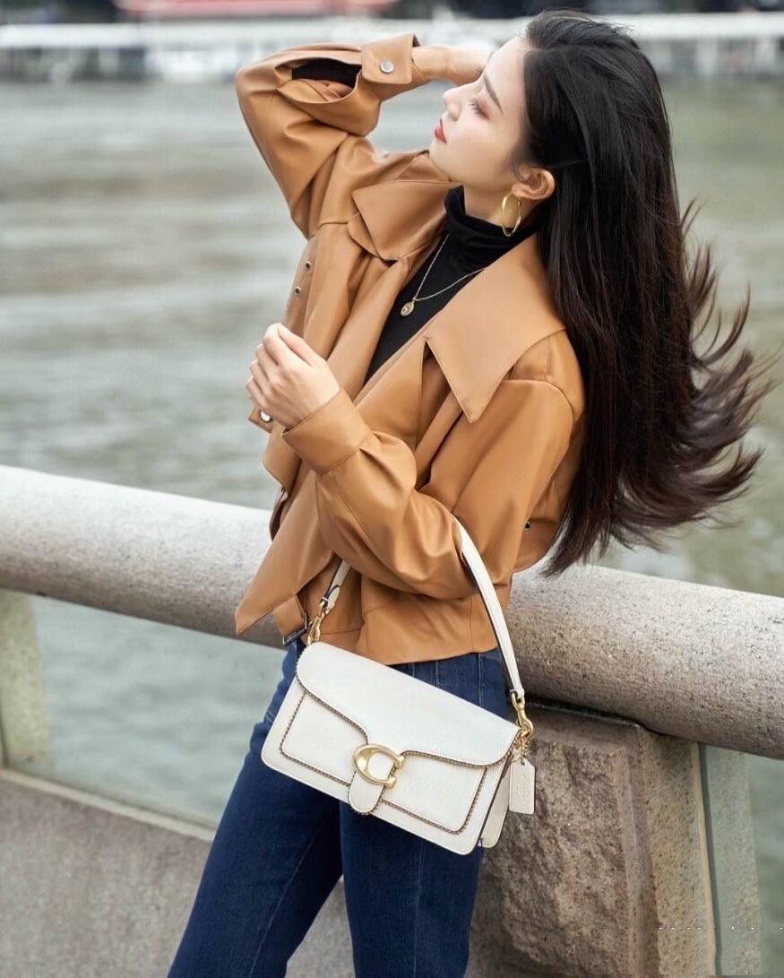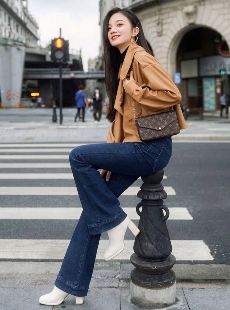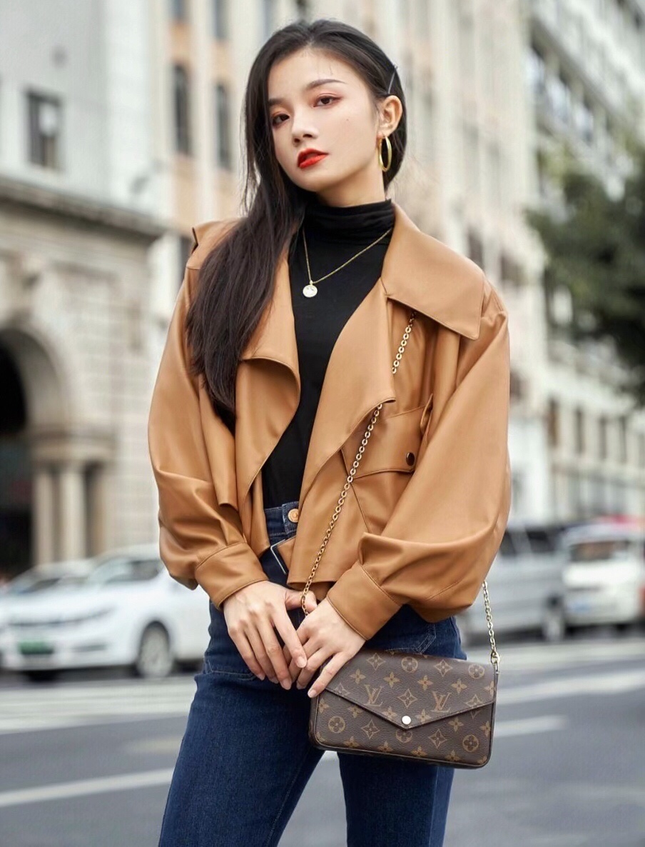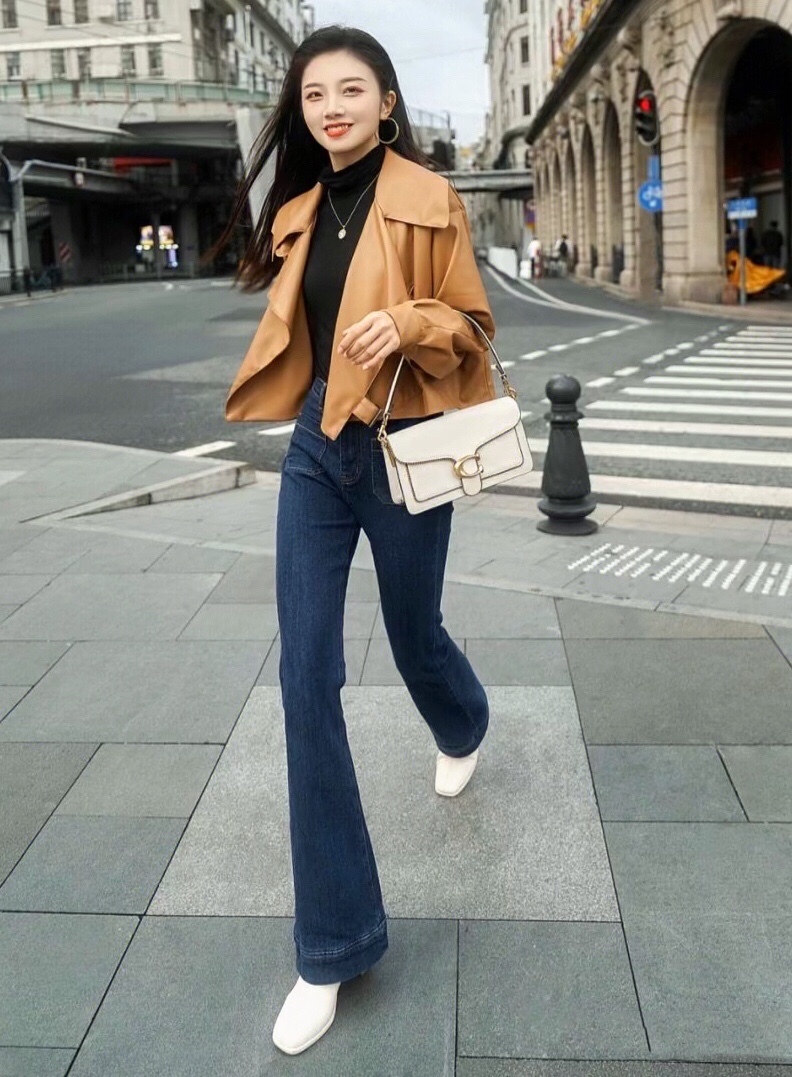 卡其色皮衣➕深蓝色牛仔裤👖纯黑色高领针织打底,气场利落!