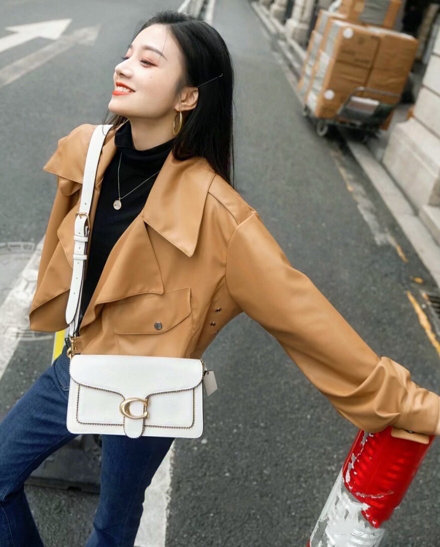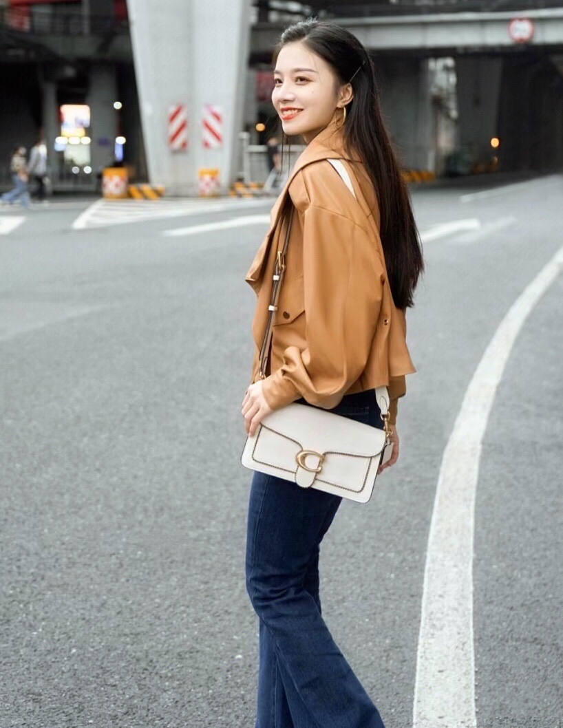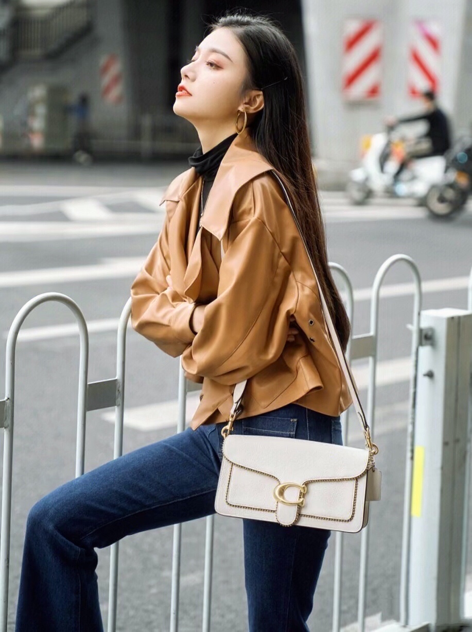 卡其色皮衣➕深蓝色牛仔裤👖纯黑色高领针织打底,气场利落!