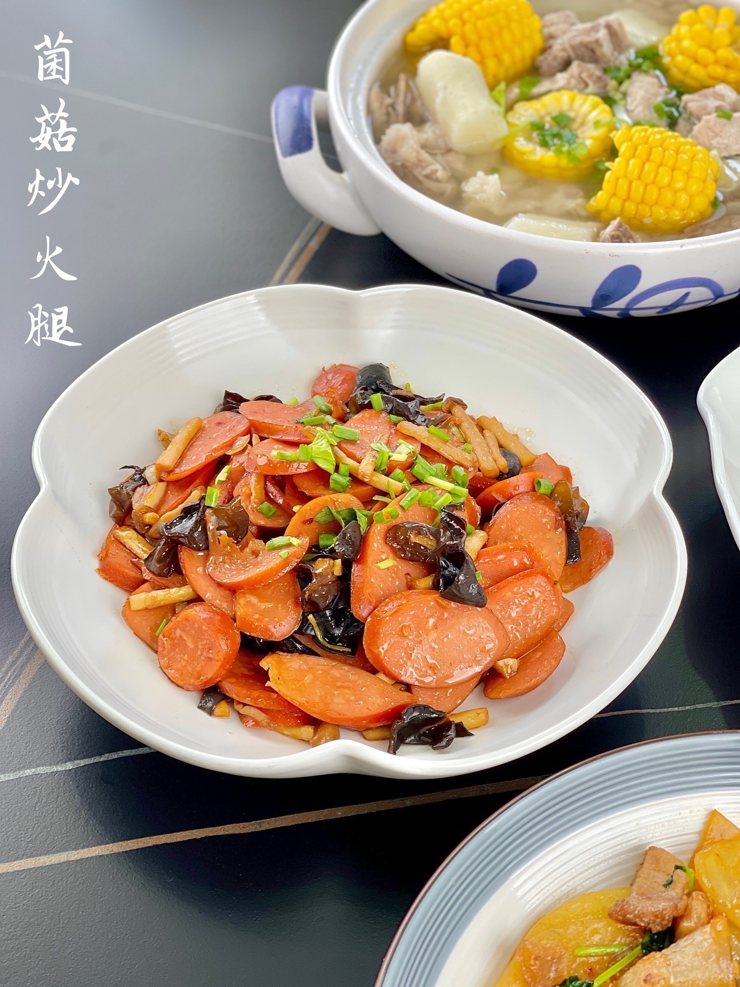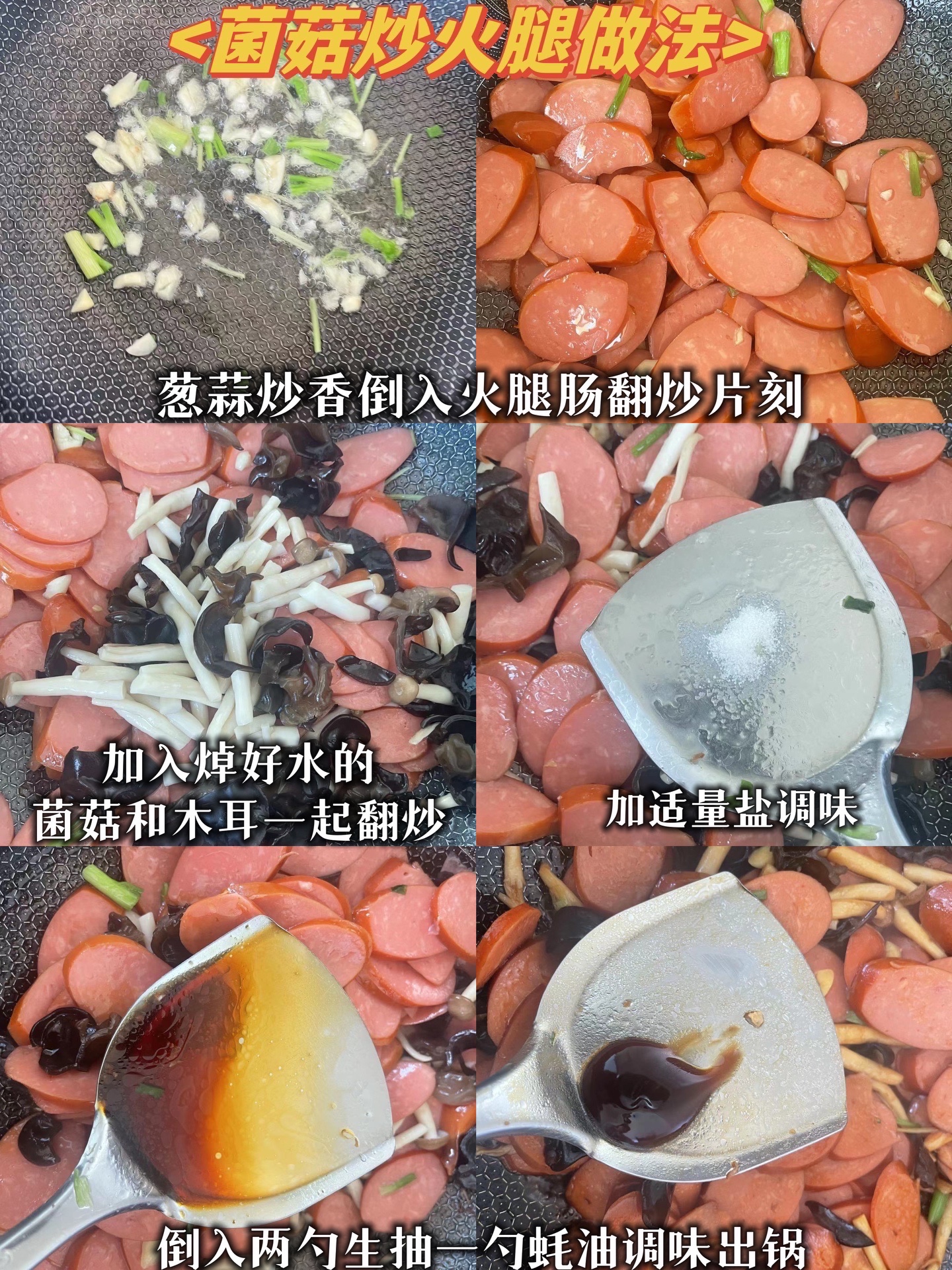 ②葱蒜炒香,倒入火腿肠大火翻炒片刻,再倒入菌菇和木耳一起翻炒。