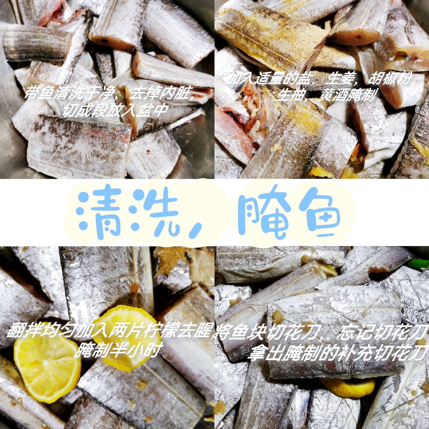 2、将带鱼去头,去内脏,洗净切段装入大碗中,放入盐,胡椒粉、黄酒,姜,葱,柠檬挤出汁翻拌均匀腌半小时,带鱼肉比较厚的将鱼肉用刀划成花刀,我是后来划的。