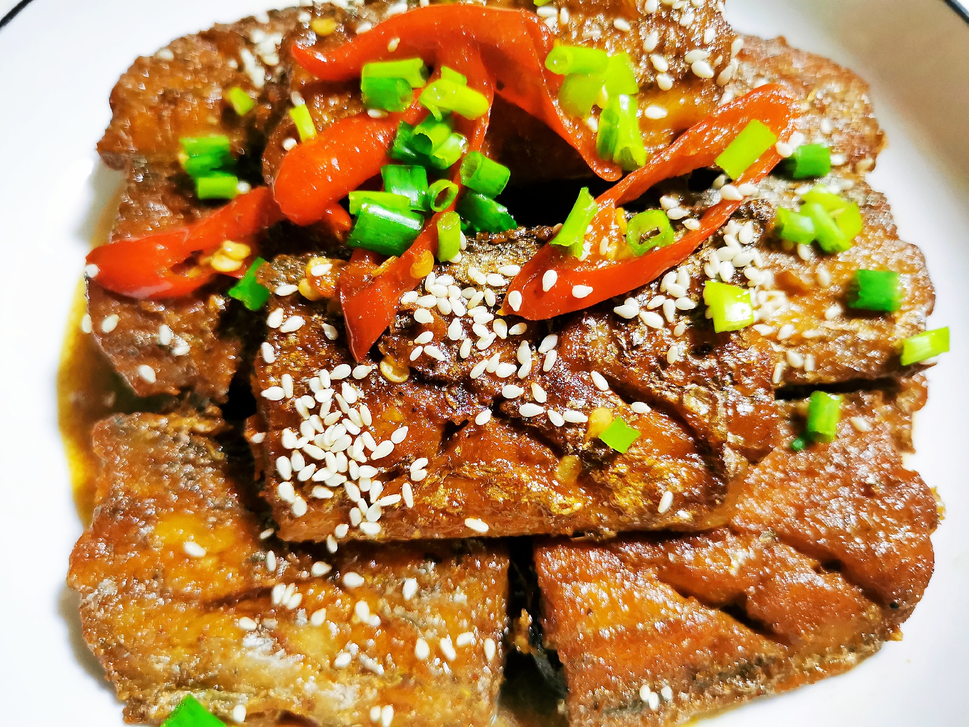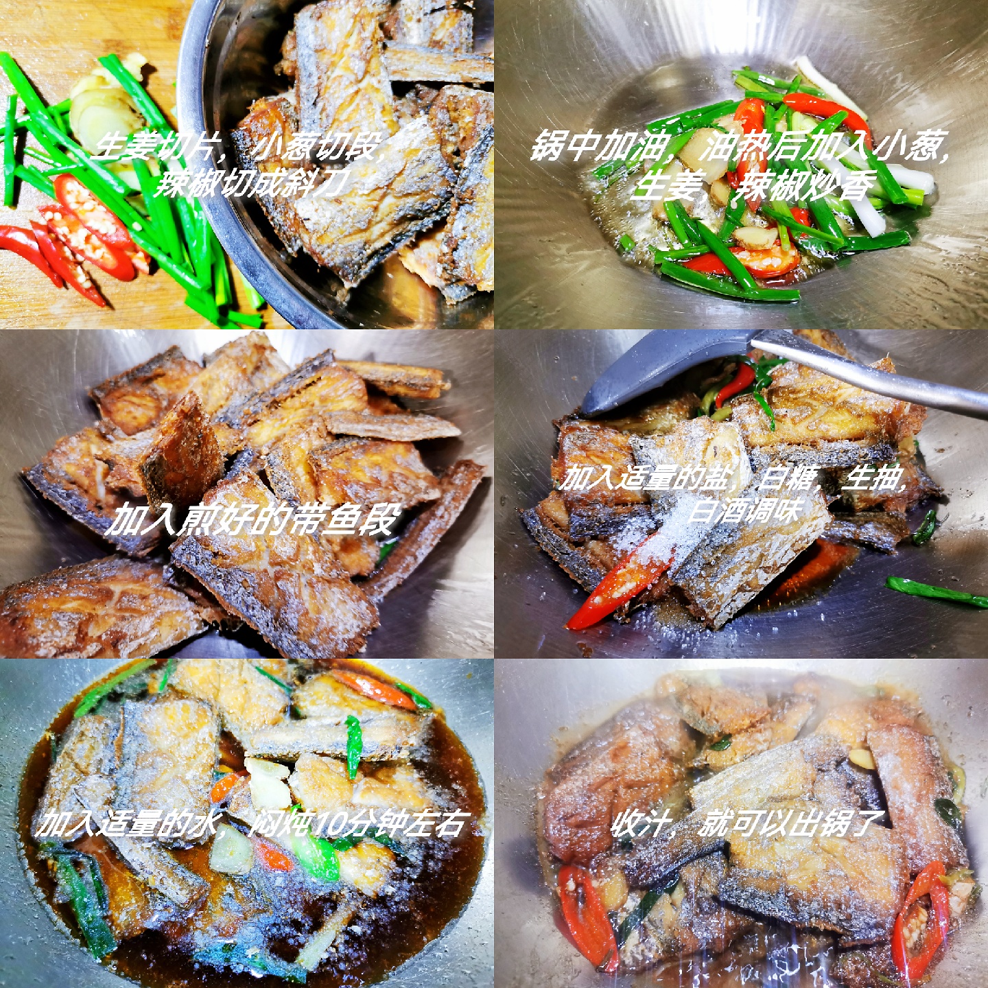 4、炒锅烧热加入少量的油,放入葱、姜及辣椒炒出香味,加入煎好的带鱼,加入盐、白糖、生抽、白酒调味,加入红烧酱油调色,加适量的水焖炖10分钟,入味后待汁浓稠时出锅即可。炖鱼一定加入热水,否则影响口感,收汁的时候可以留一点汤汁,泡饭超好吃。