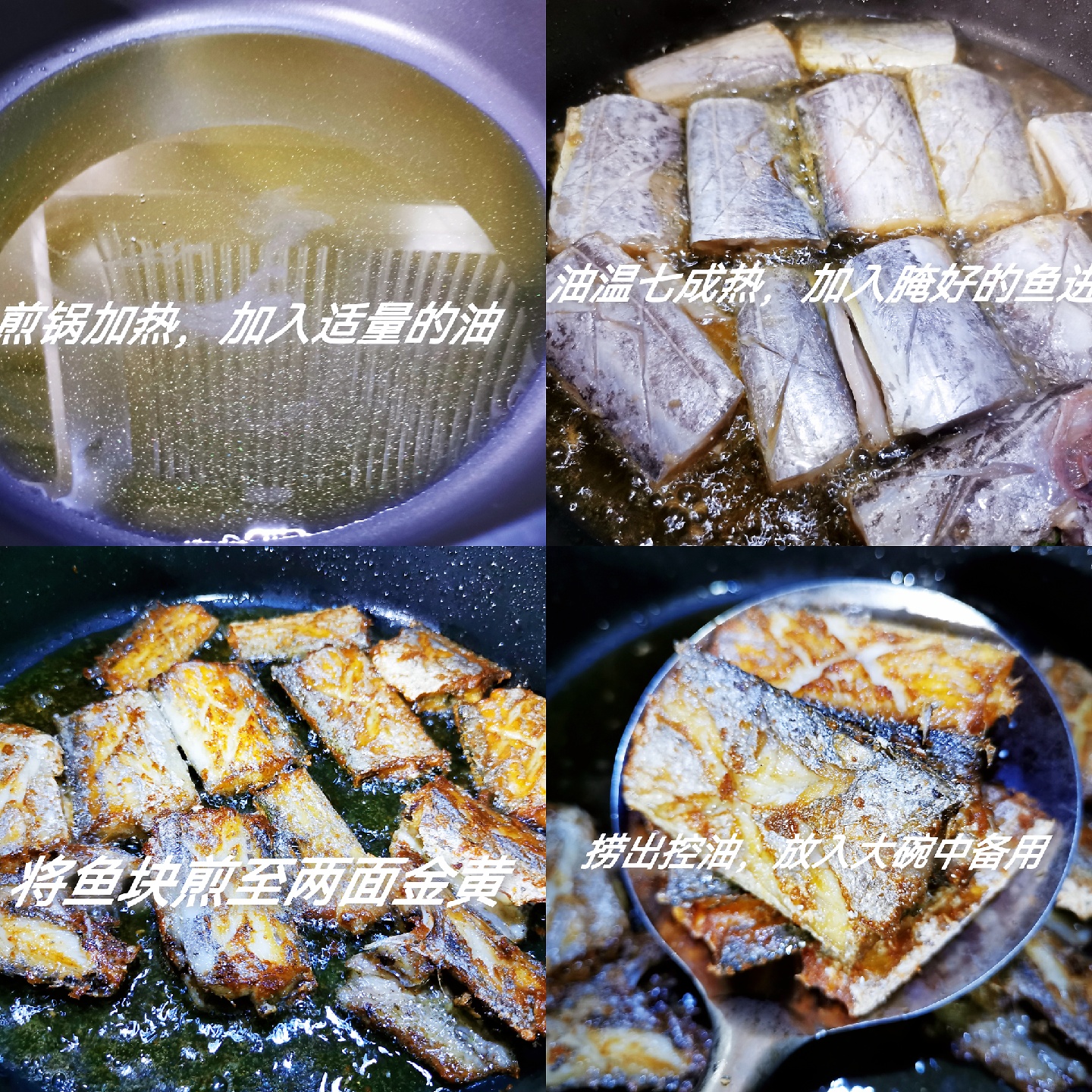 3、煎锅加热,加入适量的油,约七成热时放入腌制好的带鱼煎至两面金黄,控油捞出,煎鱼的时候 一定要等一面定型了 再翻面,否则容易不成型。