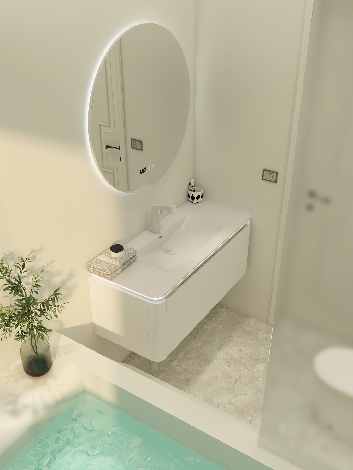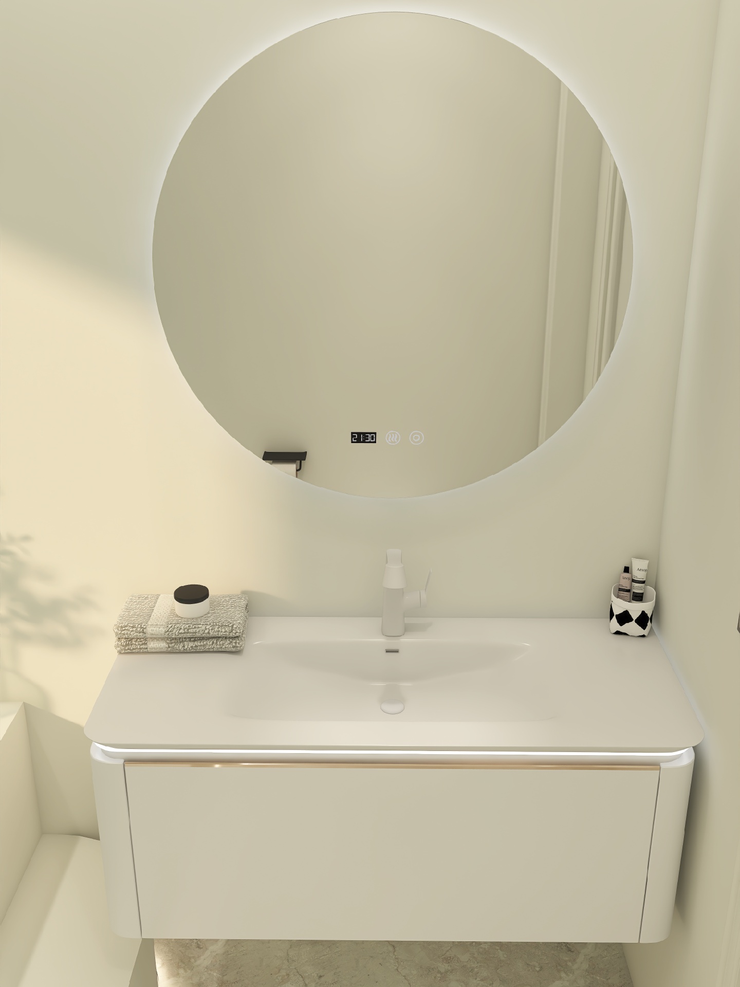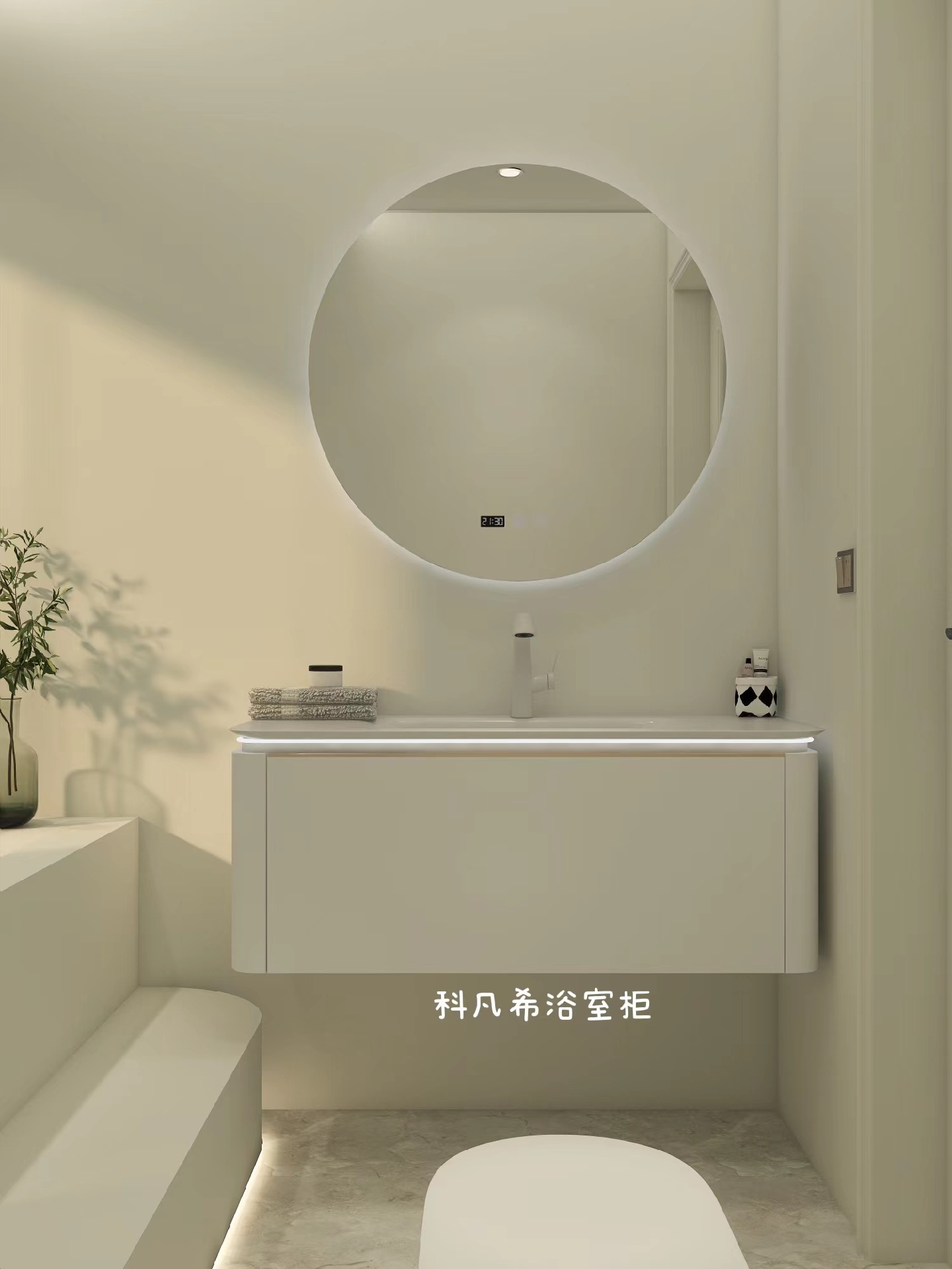 🌟 这浴室柜真的绝美~圆形的镜子显得更为精致,外圈的照明系统柔和唯美~