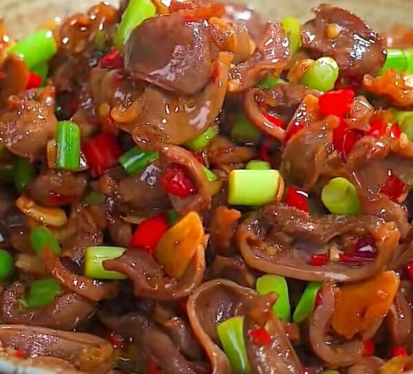 1.把鸡胗洗净切片,蒜苔切丁备用
