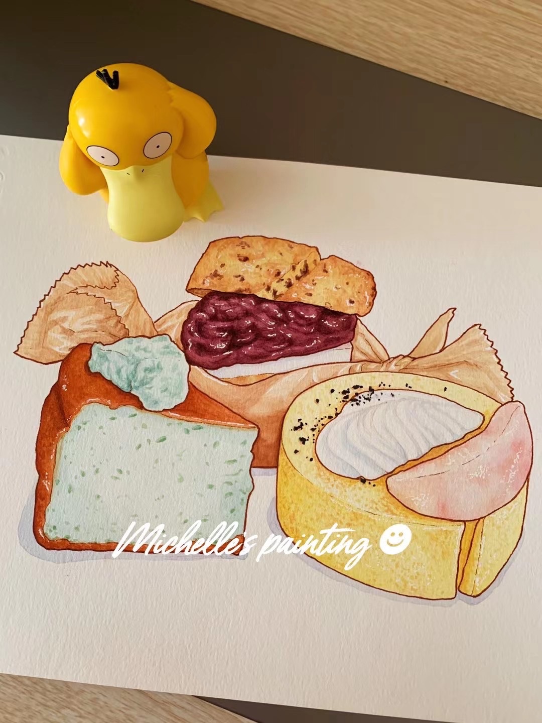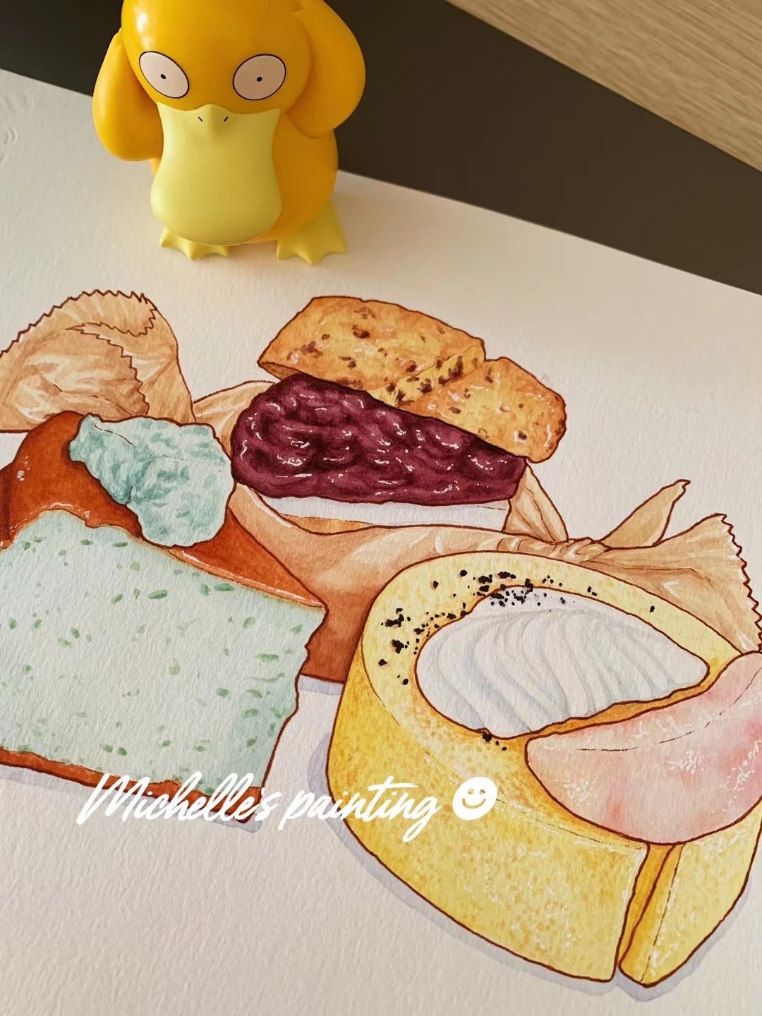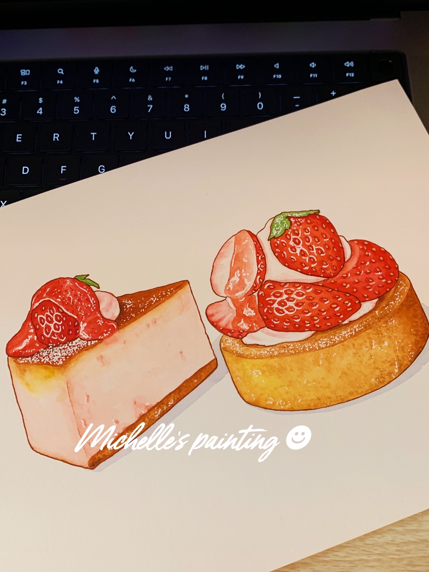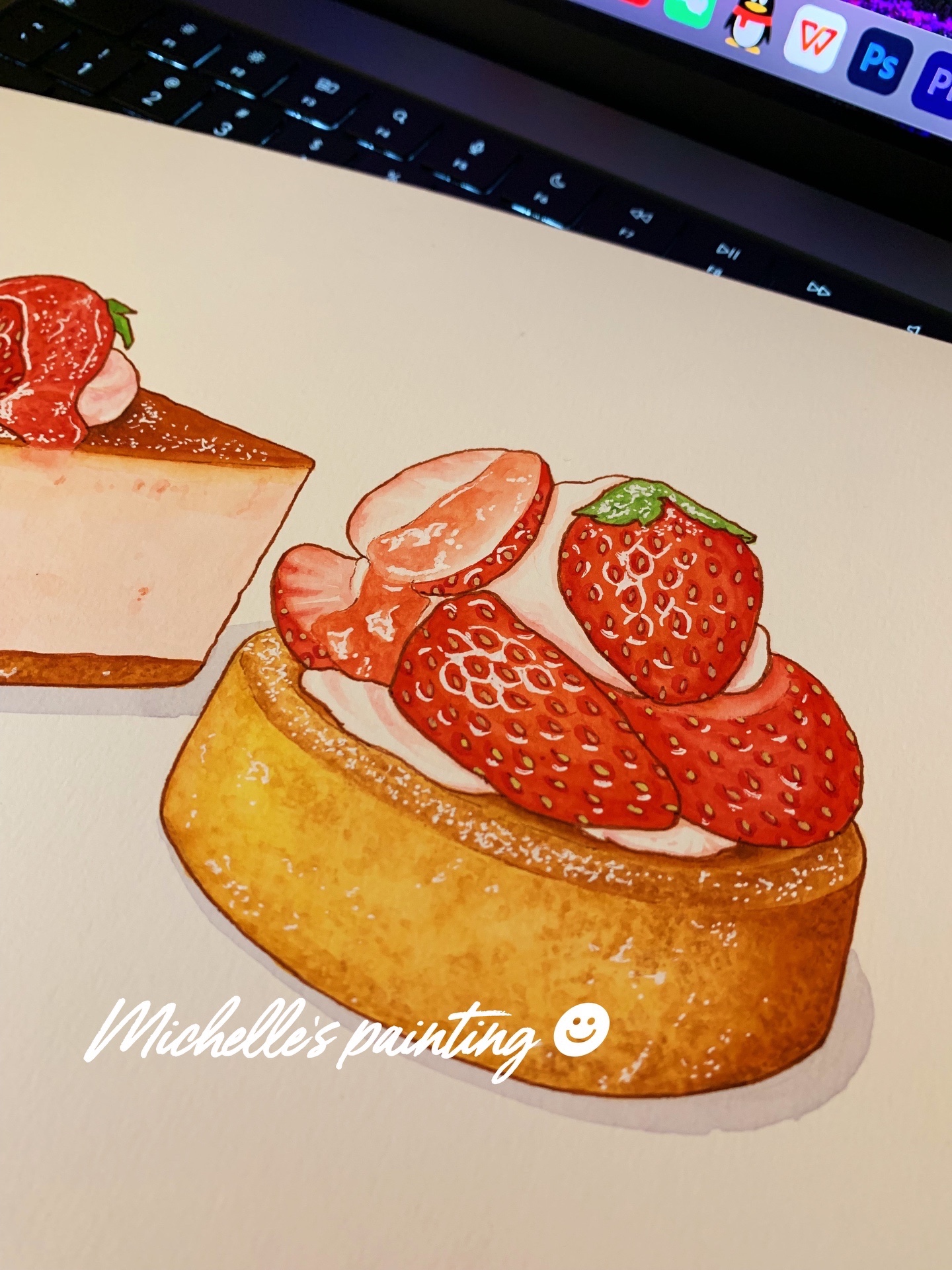 Michelle手绘水彩美食插画|薄荷巴斯克和草莓芝士蛋糕