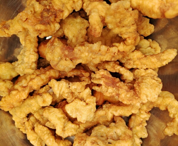 6:再将油温升至7成,下入酥肉复炸20-30秒,马上捞出,撒上一丢丢椒盐,即可