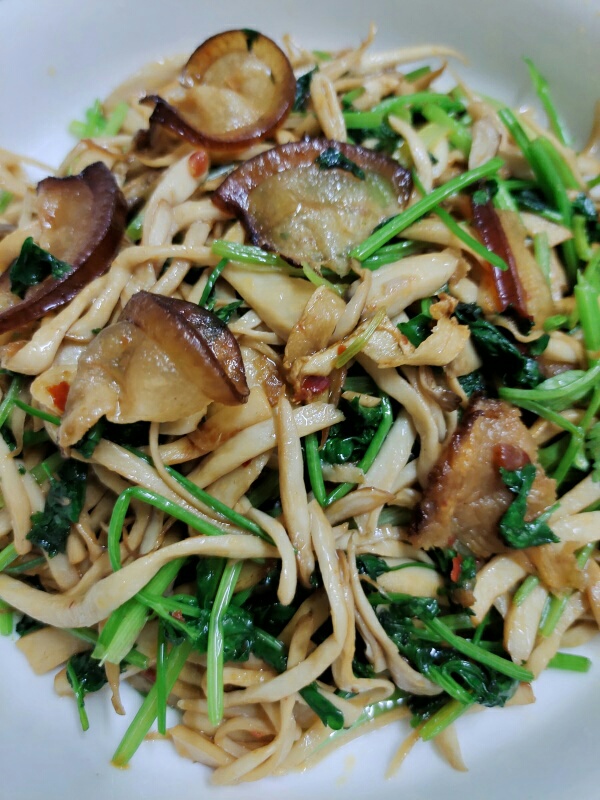 1.腊肉切薄片,(没有可用五花肉)杏鲍菇切丝备用